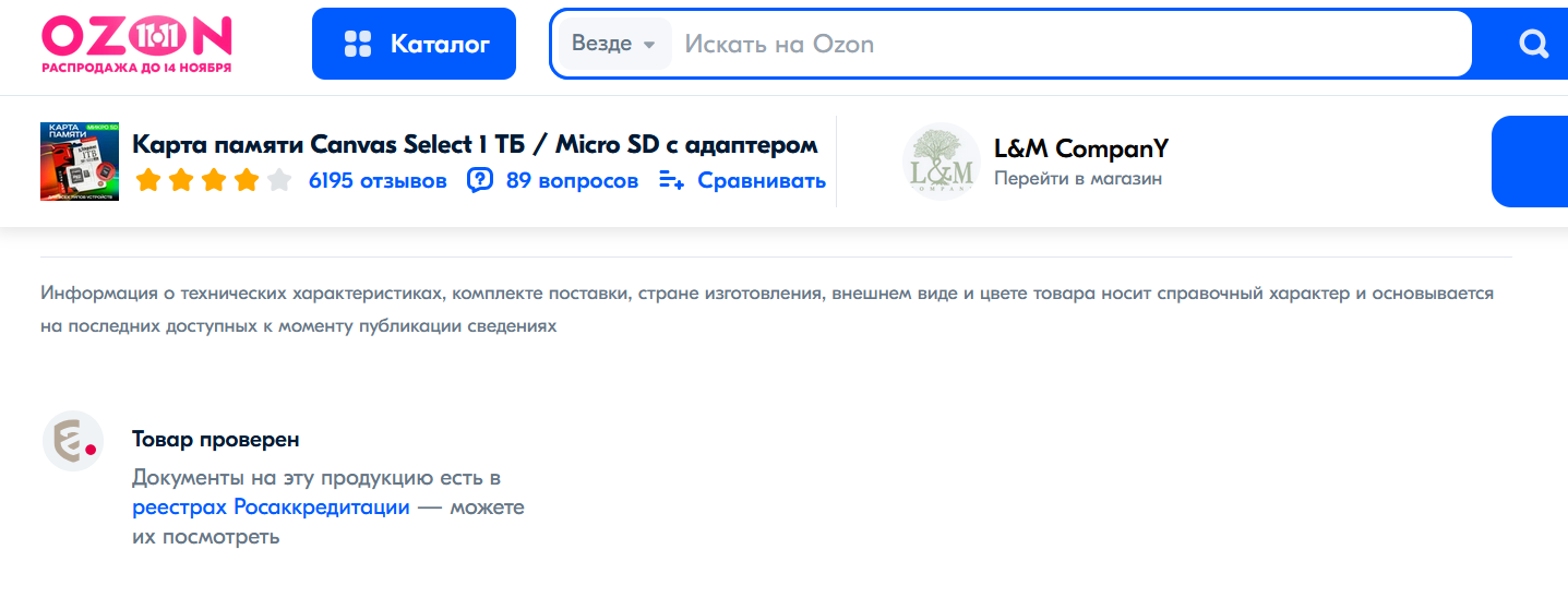 Что еще интереснее, у карты на Ozon висит пометка о наличии сертификата Россаккредитации. Мне кажется, что все мошенники первым делом бегут получать эти сертификаты, будь то соответствию по электромагнитному излучению или еще там чему-то. Или просто загружают любой, что найдут.