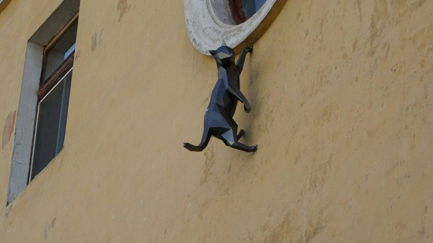 В Красноярске на фасаде дома №33 по улице Вавилова есть фигура чёрного кота. Зверь будто зацепился за окно и с любопытством наблюдает за прохожими.