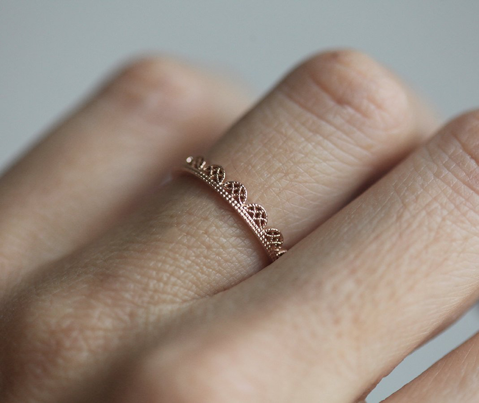Филигранные кольца изготавливаются путем создания замысловатых узоров с помощью тонких ниток серебряной или золотой проволоки. Некоторые ювелиры также используют бронзу или платину.