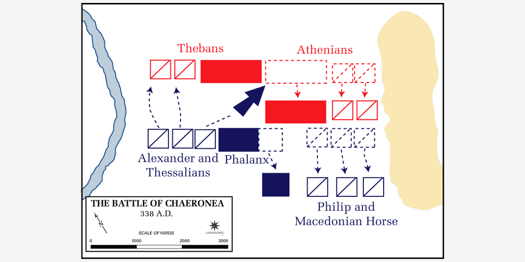 Перед Филиппом стояла довольно сложная задача: придумать, как развернуть греков, чтобы они сдвинулись со своей позиции и оголили фланги. Царь, как и всегда, занял место на правом крыле своей армии — против афинян; Александр командовал левым и противостоял фиванцам, которых на тот момент считали лучшими воинами Греции.