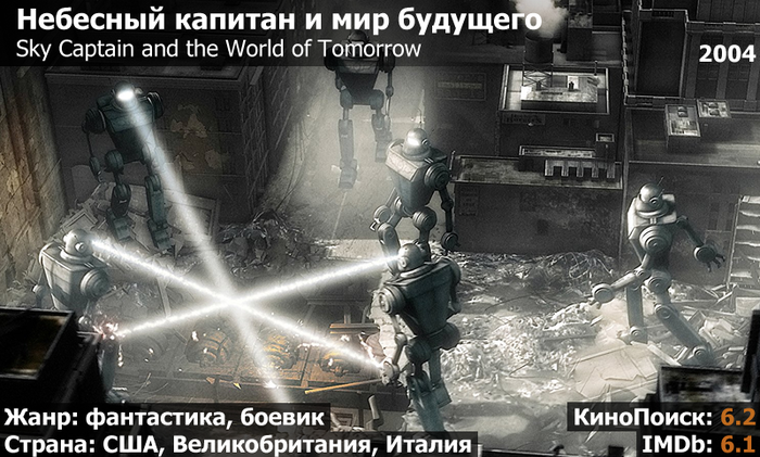 Если вы не смотрели этот, как его называют, ретро-комикс-фильм, то я не буду вам врать — он не очень-то получился. В лучшем случае его можно рассматривать как образец экспериментального блокбастера с некоторыми интересными наработками, которые оказались по нраву кинокритикам, но, к сожалению, не впечатлили обычную публику. Из любопытного в фильме присутствуют: интересная стилизация а-ля 30-е годы с отсылкой к кинолентам той эпохи, относительно новая для времени создания кинокартины технология CGI, ну и актеры Гвинет Пэлтроу, Анджелина Джоли и Джуд Лоу.