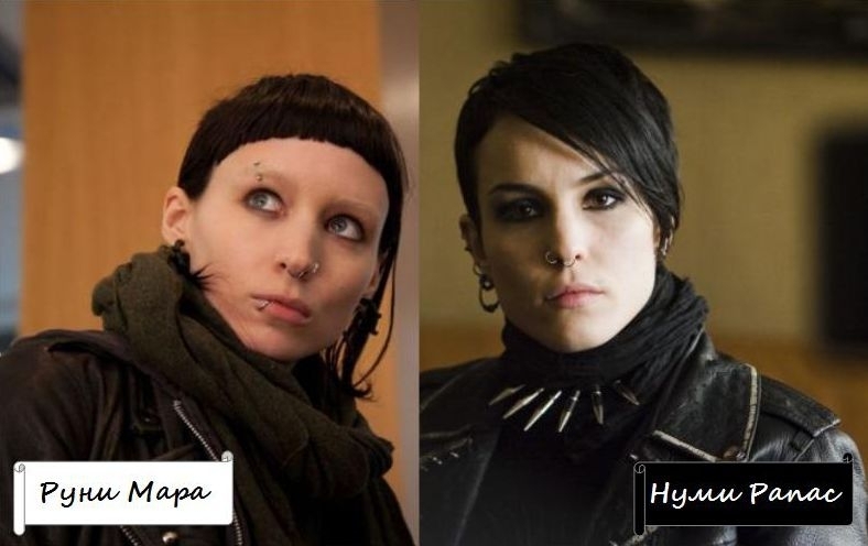 У Нуми Рапас получилась какая-то затравленная девочка, которая прячется в пирсингах и кожанке, да и дракон стремноват))) а Руни Мара, на мой взгляд, отыграла именно жесткую местами мужеподобную девушку. Ее образ круче и брутальнее.