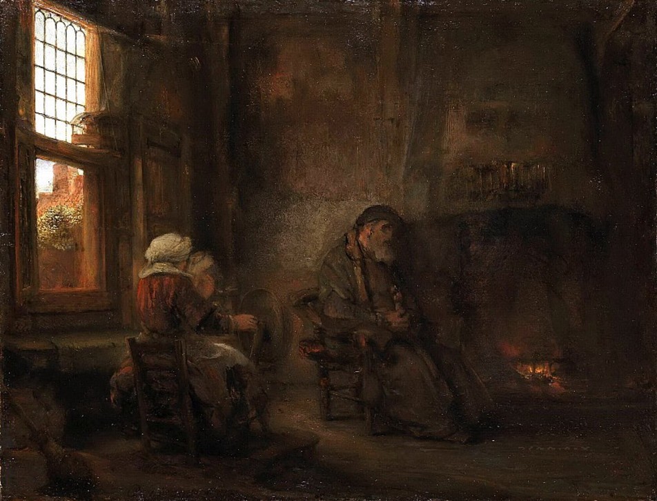 Но только, если это философ, то немного странно - обычно изображения ученых щедро снабжали их стандартной атрибутикой - ну хоть астролябию или глобус бы какой нам показал бы, наверное, художник. Вы можете сказать - ну это же Рембрандт, мастер переосмысления сюжетов, может себе позволить. Но, помимо старца, на картине отчетливо видна еще одна героиня - старушка, разжигающая огонь в очаге. И, оказывается, что из-за потемневшего за столетия лака, остается почти неразличимой третья фигура - на лестнице стоит женщина с корзиной в руках. Ее, кстати, было и правда не видно настолько, что о ней узнали благодаря гравюрам, выполненным по картине, пока она еще не была такой темной.