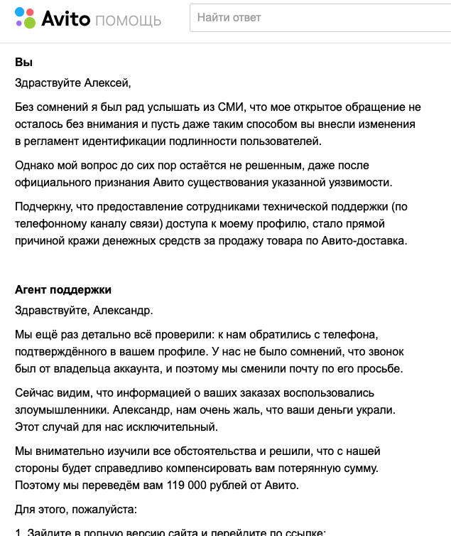 Но вот о чем я хотел бы еще сказать. То что Авито под социальным давлением признало существование уязвимости, приняло оперативные меры и даже решило компенсировать потерянные средства несомненно является плюсом (не минусом точно). Но мне хотелось бы вернуться в конец декабря 2020 когда я несколько дней провел на телефоне и в переписке с технической поддержкой Авито и все время получал один и тот же ответ: "Мы не знаем как вас взломали, обращайтесь в полицию", а потом к этому добавлялись и вовсе выходящие за рамки высказывания типа: "Безопасность профиля - дело самих пользователей, поменяйте пароль и прочее". И даже когда я заявил, что если они не желают признавать проблему то я буду вынужден обратиться за поддержкой к профессиональному сообществу и простым пользователям, меня просто проигнорировали. Сказали: "Это ваше право"