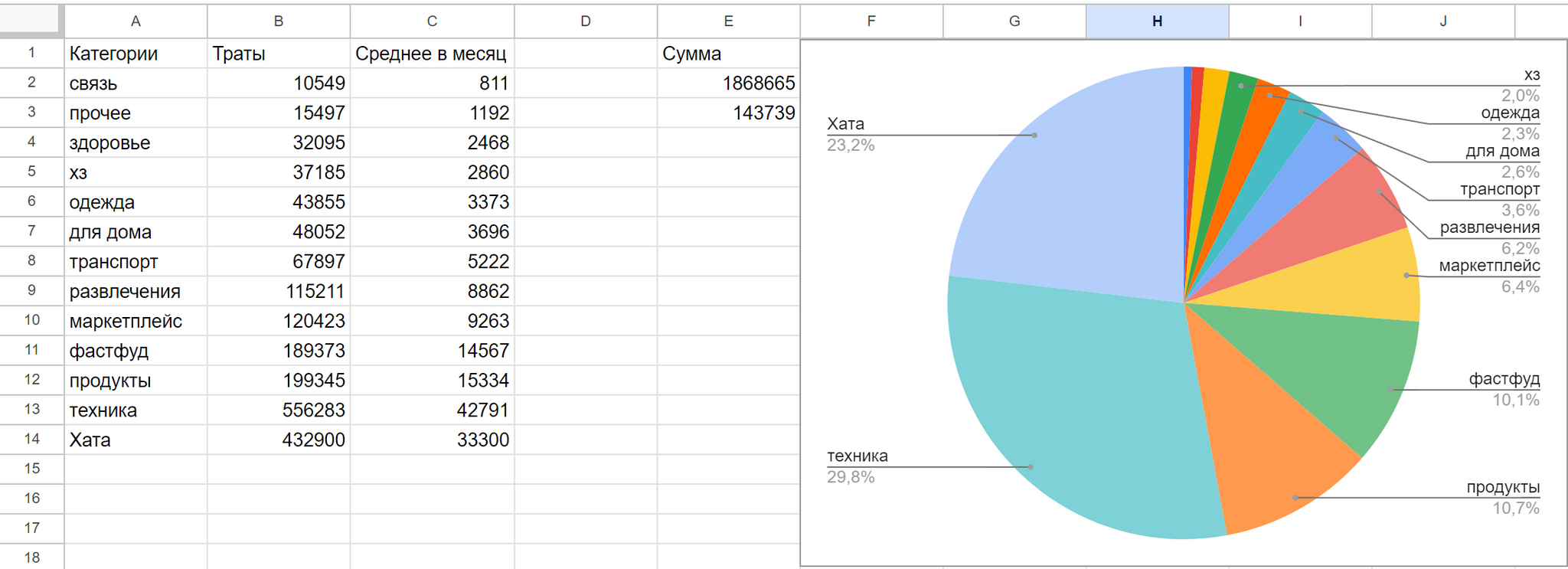 В начале февраля решил взяться хотя бы за отслеживание финансов и проанализировал траты за последние 13 месяцев(прошлый год+январь). Получилось очень грубо, но наглядно: