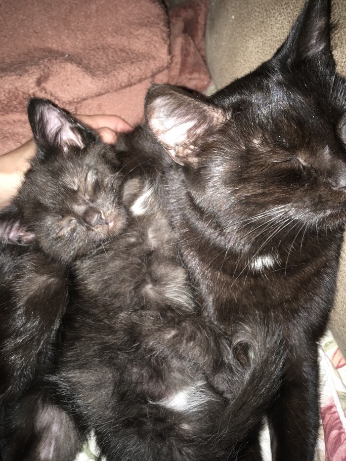 На тот момент у нас была кормящая кошка Бэтмен, которую не успели стерилизовать, поэтому малышню подложили к ней.