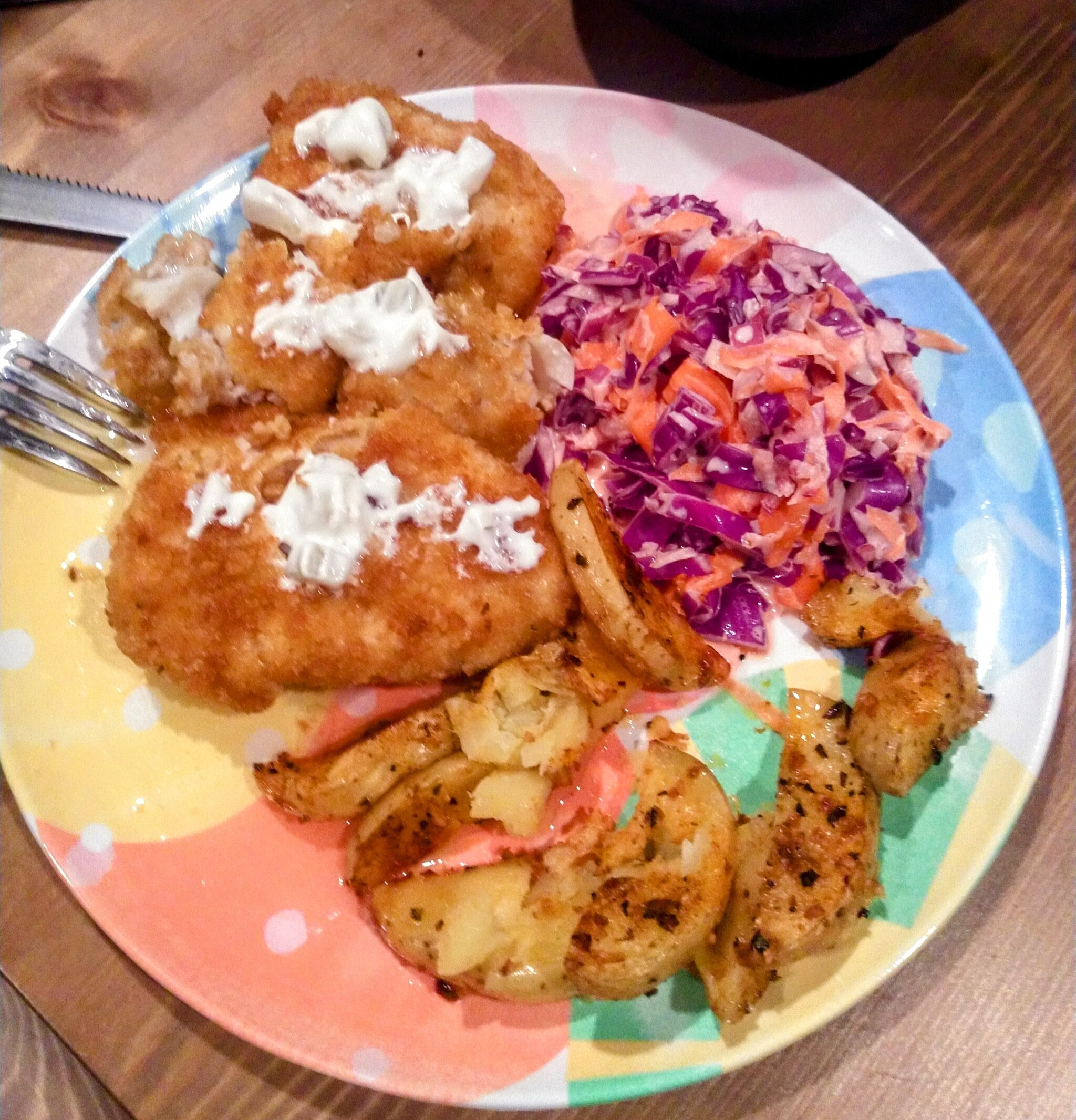 Ну, вот и все. К тому времени, как рыба будет готова, картофель будет готов, а капустный салат также будет готов, смешав все вкусы. Если у вас есть вопросы, спрашивайте! Это был первый раз, когда я приготовил это блюдо, обычно его просто подают в ресторанах, но оно получилось таким вкусным.