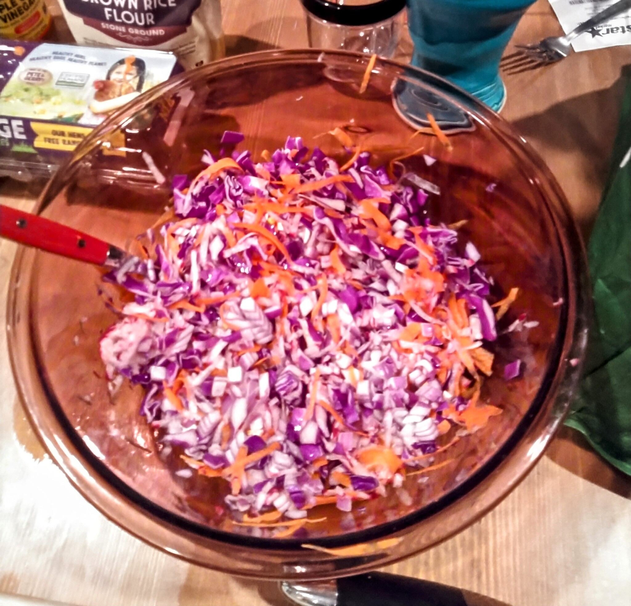 Во-первых, гарниры. Коул-слоу ("Coleslaw")— это обычное . Я приготовил его из красной капусты, моркови, красного лука и редиски. А точнее, 1/2 красной капусты, 1 морковь, 1/2 красного лука и, кажется, 5 редисок, хотя, может быть, их было 4 или 6, не помню. Нарежьте овощи тонкими ломтиками, затем смешайте.