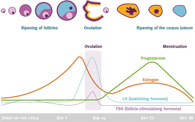 Производимое количество этих гормонов (их соотношение и преобладание одного над другим) зависит от того какая фаза менструального цикла протекает в данный момент (фолликулярная или лютеиновая). Более подробно про стратегию управления диетой во время менструального цикла, можно почитать вот в этом моем посте.