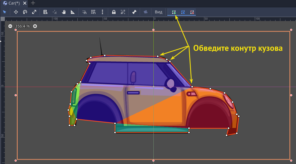 Для добавления формы столкновения выберите узел ColissionPolygon2D и с помощью точек обведите контур кузова: