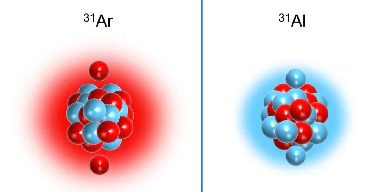 Схема распределения протонов и нейтронов в зеркальных ядрах аргона-31 и аллюминия-31. Слева - слабосвязанное богатое протонами ядро аргона-31, которое должно демонстрировать структуру гало. Справа - сильно связанное богатое нейтронами аллюминия-31