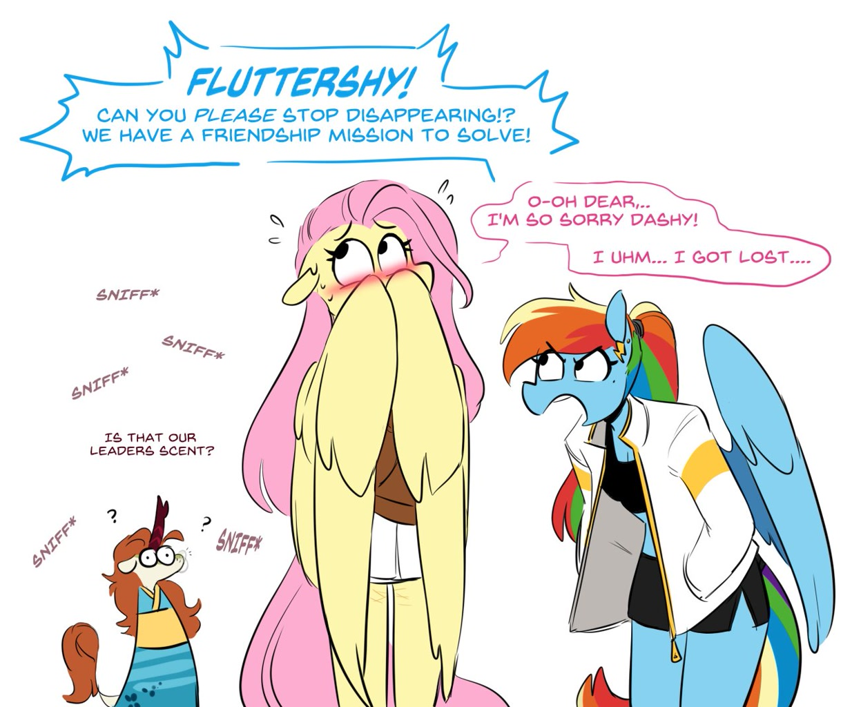 31 Runoi My Little Pony Флаттершай! Хватит пропадать, пожалуйста! У нас Миссия Дружбы так то! Серия Тайна исчезновения Флаттершай 2 года назад *Нюх* *Нюх* Это запах нашего лидера? *Нюх* *Нюх* My Little Pony Fluttershy Rainbow Dash Autumn Blaze Антро Ещё 0