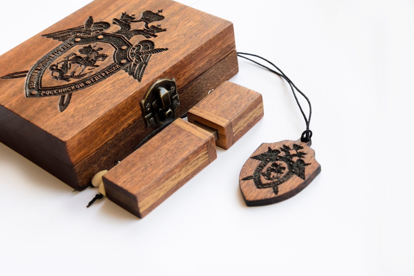 Комплект для сотрудника следственного комитета. Портсигар, флешка 3.0 и кулончик. Красное дерево, ясень и лазерная гравировка места работы)). Пропитано маслом и отполировано воском.