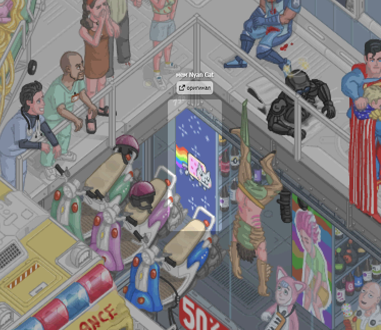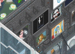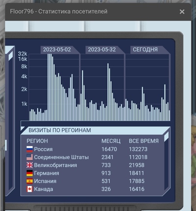 В этом блоке аж 2 интерактивных элемента. Первый - звуковой и думаю вы его без труда найдете, а второй - это статистика этажа в реальном времени. Кликните по экрану на стене, чтобы открыть его в большом размере. На экране выводится кто сейчас зашел посмотреть этаж, статистика кликов по всем элементам этажа, статистика посещения по дням и странам.