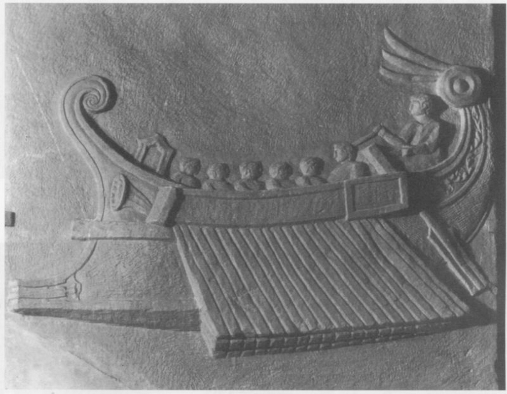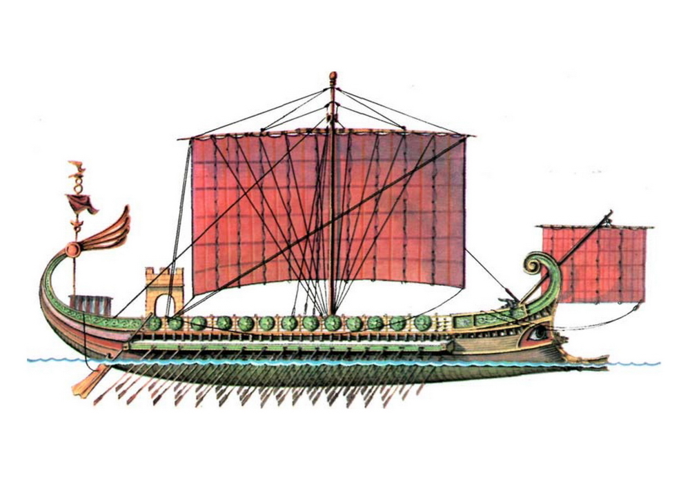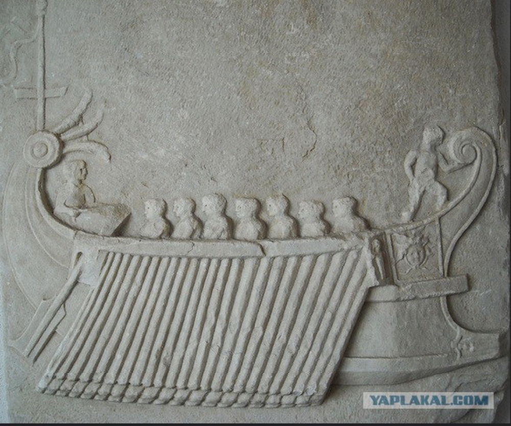 Римская трирема. Отсюда взято крепление переднего паруса, знамя и линия щитов: