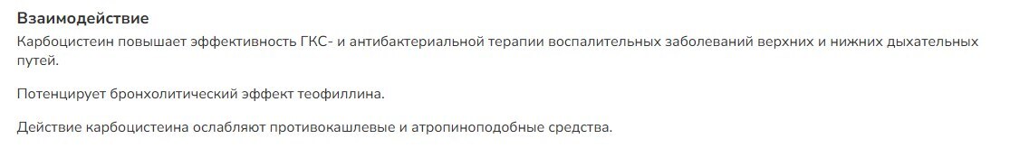 Действие карбоцистеина ослабляет противокашлевые и атропиноподобные средства.