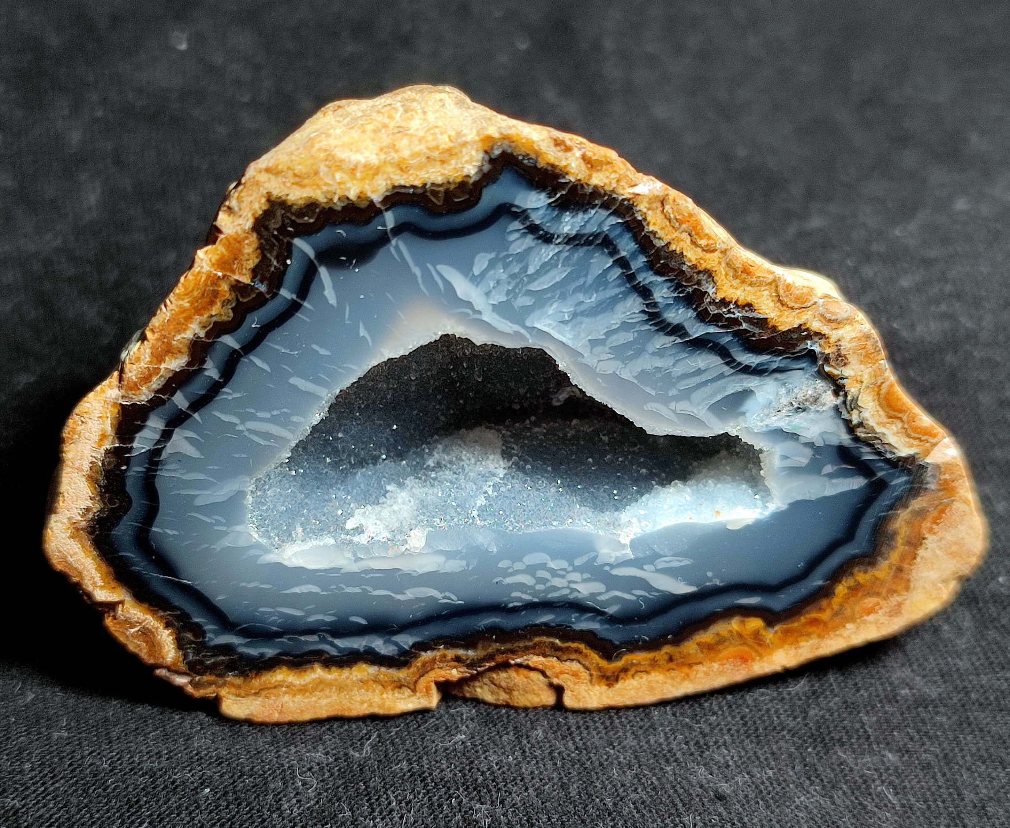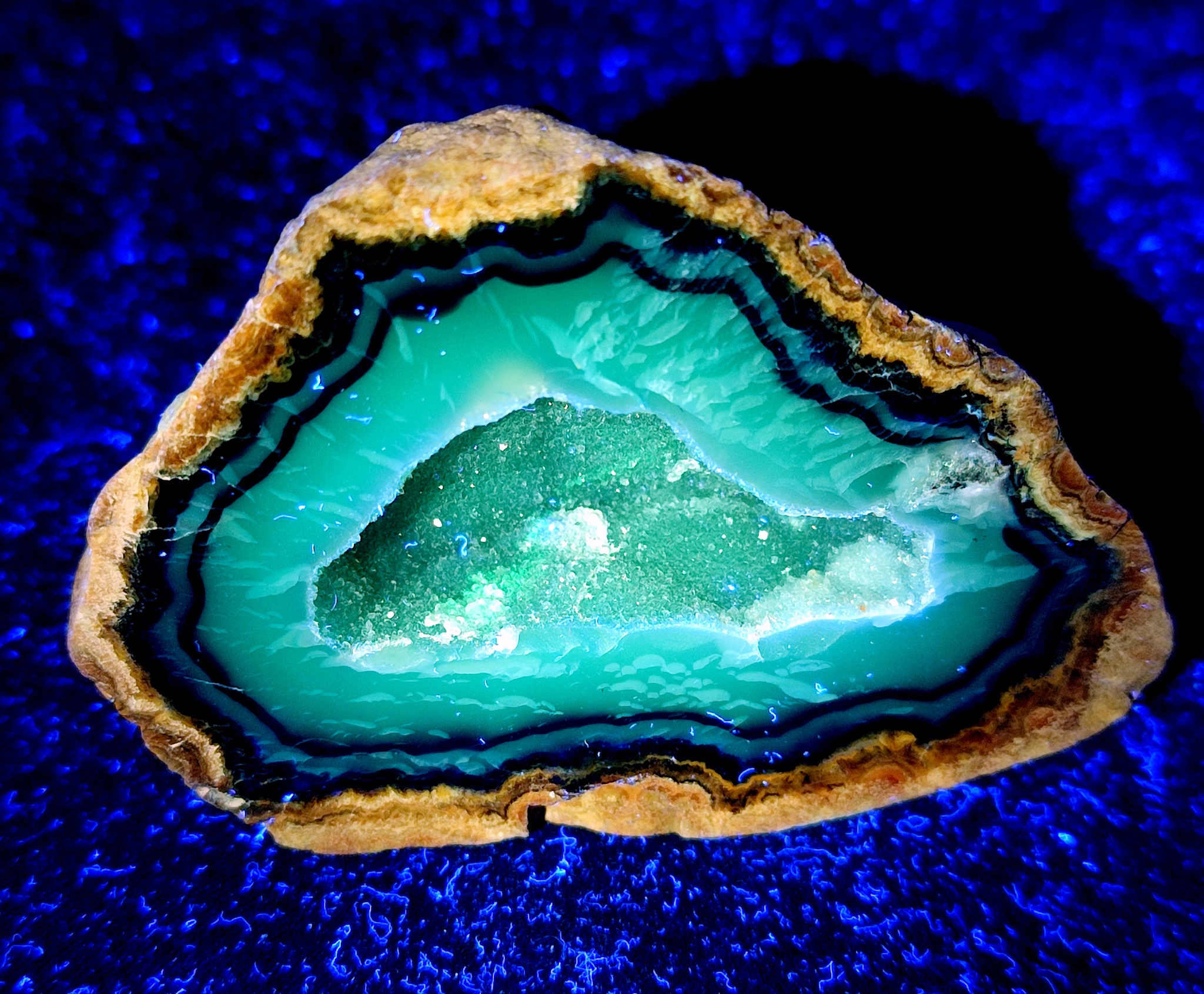 Приехал ко мне забавный агатик из Монголии, пустыня Гоби. Хорошо флюоресцирует, собака, под ультрафиолетом 365 нм. Под 395 нм не хочет совсем.