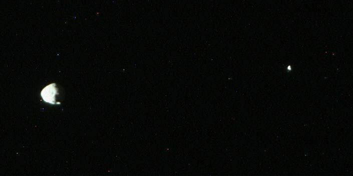 Уникальный снимок, переданный Curiosity: Фобос и Деймос с поверхности Марса в одном кадре.