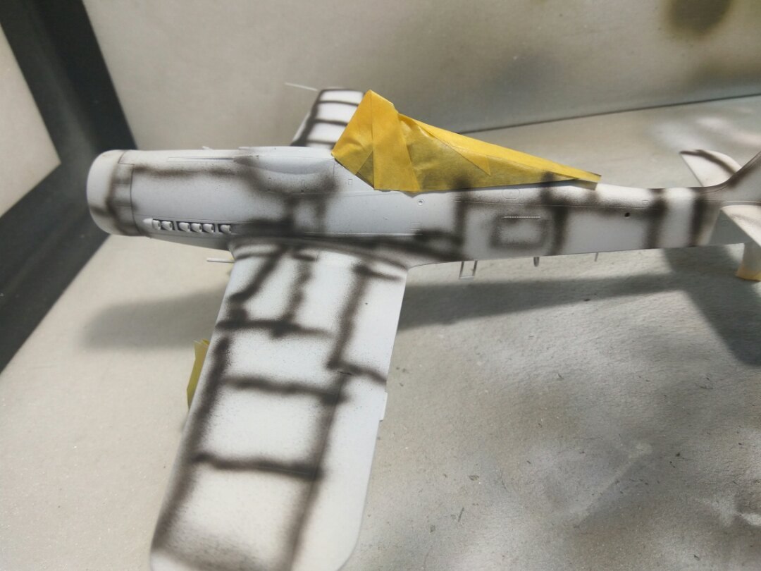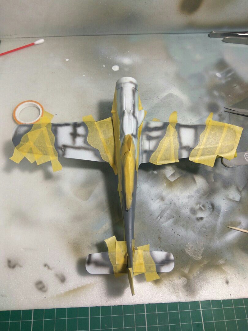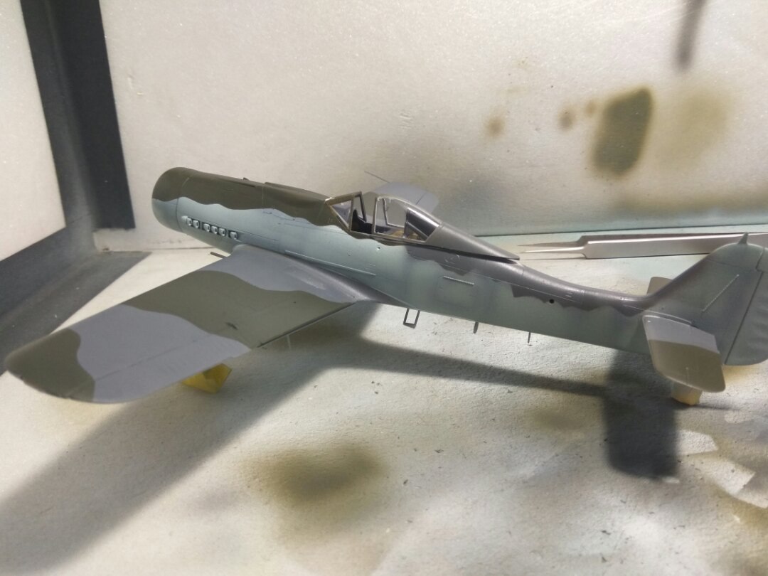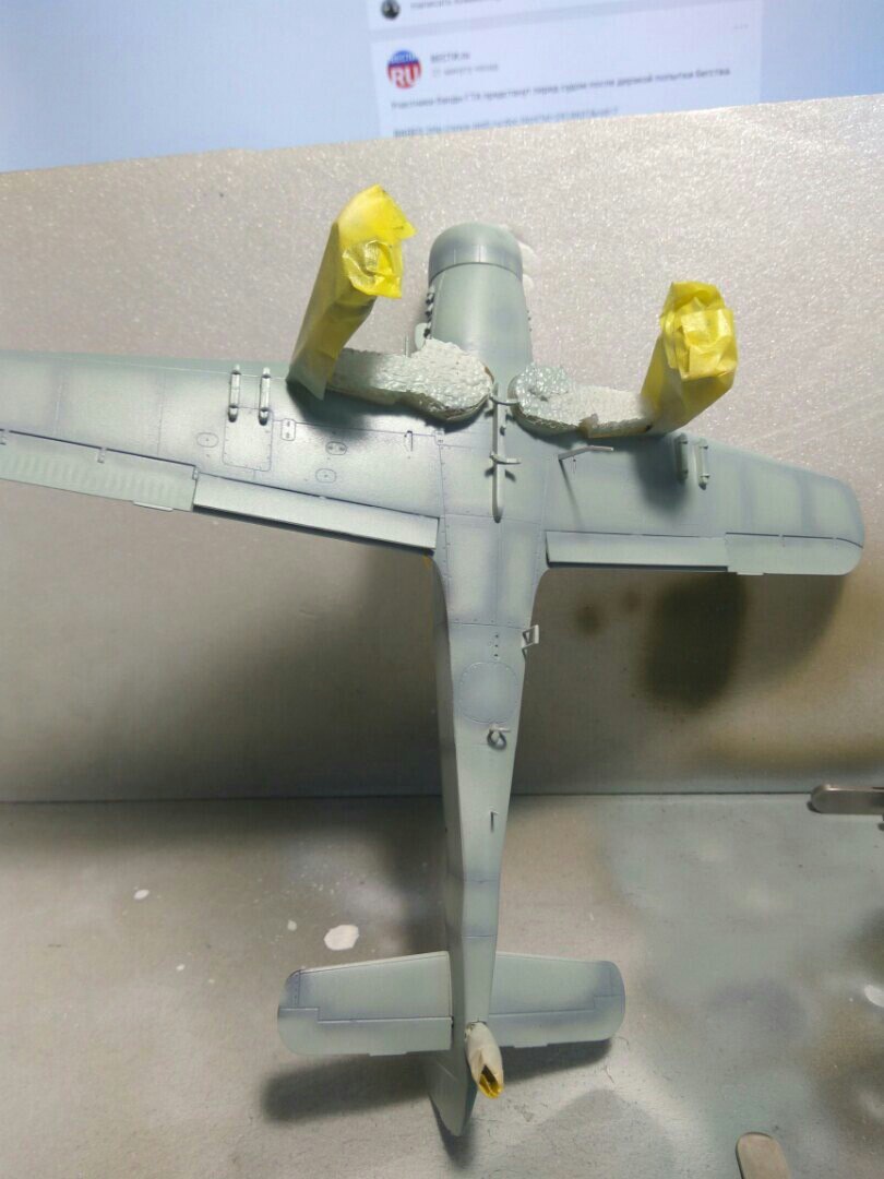 Пузо - серо-голубой RLM76, нос - зелёный RLM83, крылья зелёный RLM83/ тёмно-серый RLM75. Сперва наносил серый, потом зелёный.