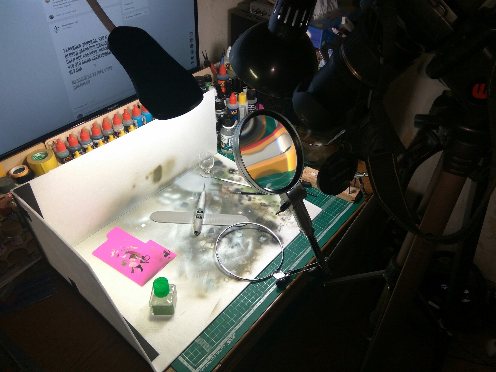 Стоит отметить, что травло предназначено для модели TAMIYA, но я не ожидал подстав, так как искренне считал, что уж размеры панелек-то в масштабе можно соблюсти. Щас. Набор не подходит!!! Пришлось доводить напильником, что крайне обидно. Работа над кокпитом привела к мысли, что нужна большая лупа. На лампу с лупой денег жалко, она стоит как хороший аэр! Поэтому приобрёл настольную, но уже к концу работы над моделью.