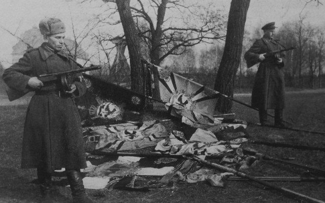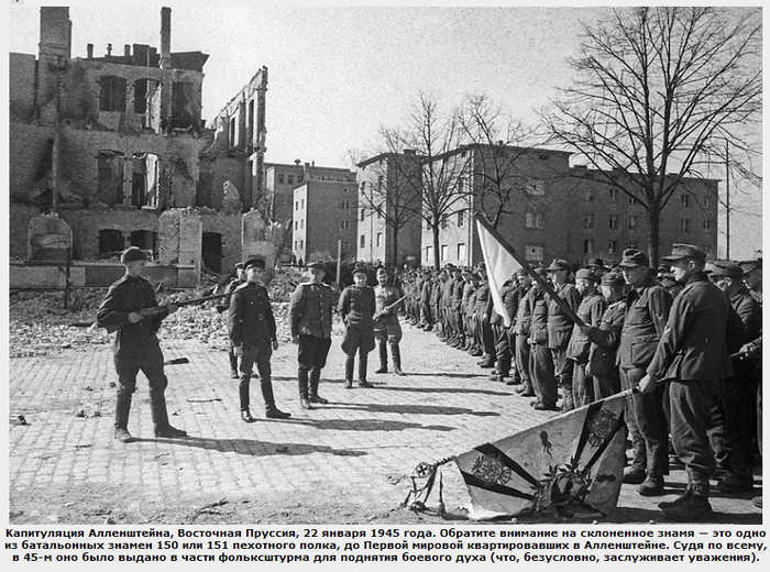 Капитуляция батальона в Аллерштайне. (К слову, с 1943 года вермахт свои знамена хранил в тылу, было запрещено держать их поблизости от фронта. А старые знамена наши в параде Победы не использовали, а совершенно бесплатно отдали ГДР, как исторические артефакты...)
