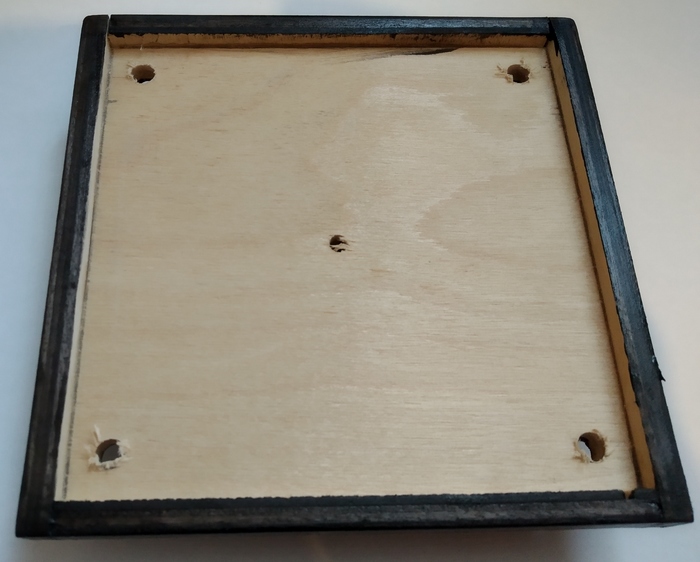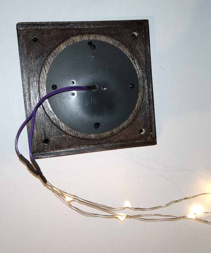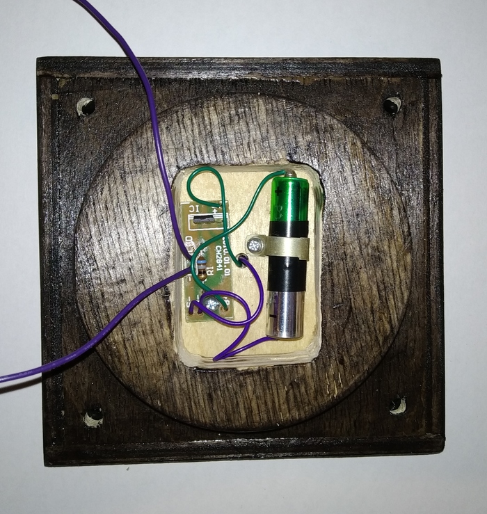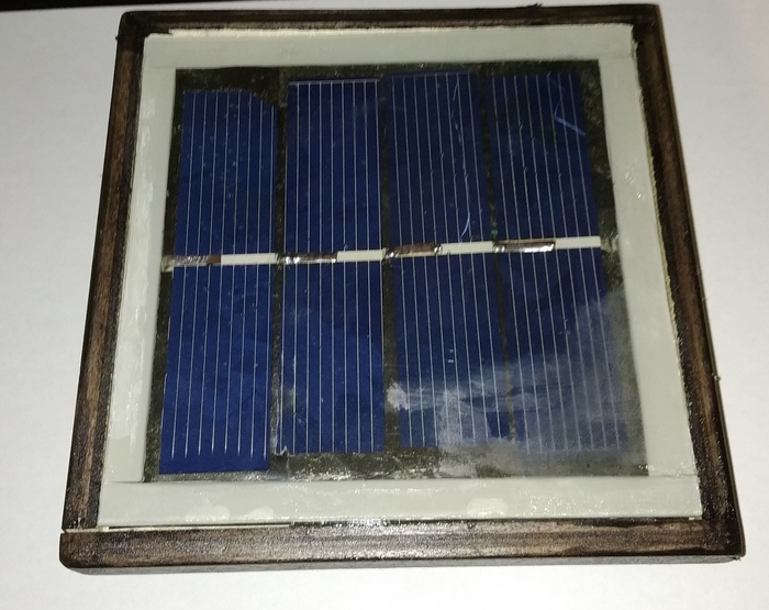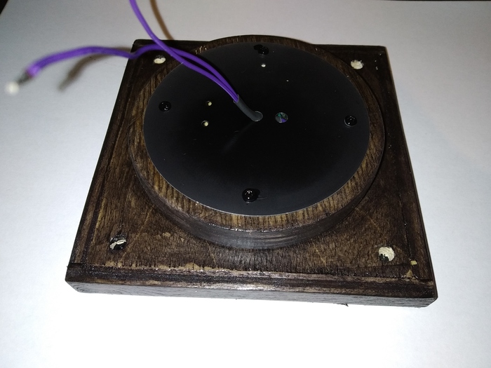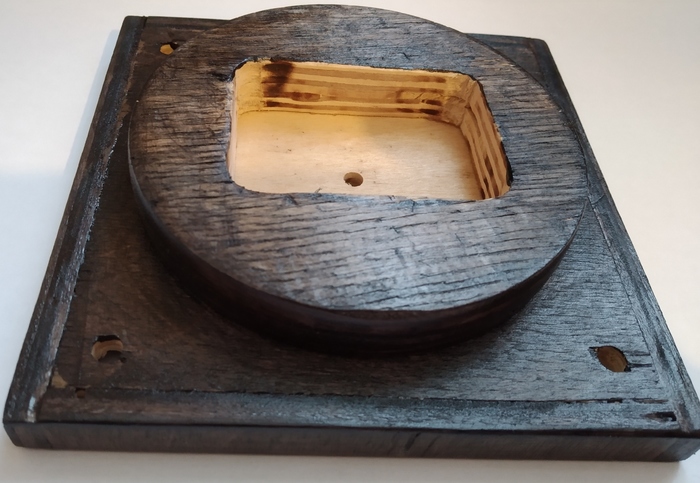 Круглая "пробка" из фанеры 10мм с вырезанным приборным отсеком, крыша из фанеры 6мм с бортиками и отверстиями под стойки. Все склеено клеем ПВА и покрашено акриловым лаком с эффектом морилки. Солнечная панель приклеена на двусторонний скотч (в будущем хочу ее заменить на более удачный вариант, эту сделал криво и случайно залил ацетоном, поэтому она местами мутновата):