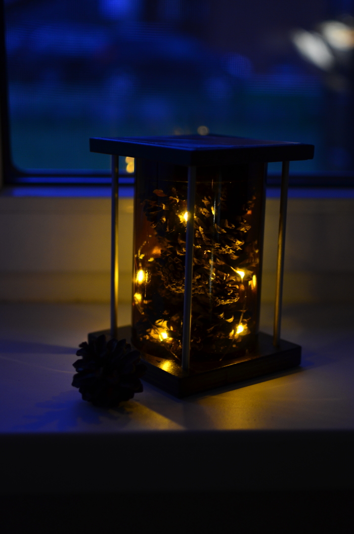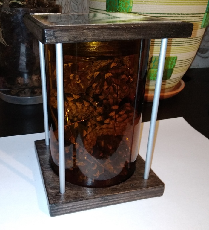 Но иногда душа просит прекрасного, руки в меру своих возможностей пытаются создать что то, хотя бы отдаленно напоминающее это прекрасное. В общем идея набить сосуд чем то и чтобы между наполнителем светились огоньки преследовала меня давно. И вот какое то время назад мне на глаза попалась бутыль из под спирта на работе. Хорошая такая, большая, из темного стекла. Как раз в это же время я переехал на новое место жительства и во дворе дома росла прекрасная сосна, земля вокруг которой была усыпана шишками. Пазл собрался и я решил набить бутылку шишками и подсветить гирляндой. Проводов никаких не предполагалось, все должно быть на солнечной энергии. Сам источник энергии и света лежал уже давно на подоконнике и сиротливо освещал окно каждый вечер: