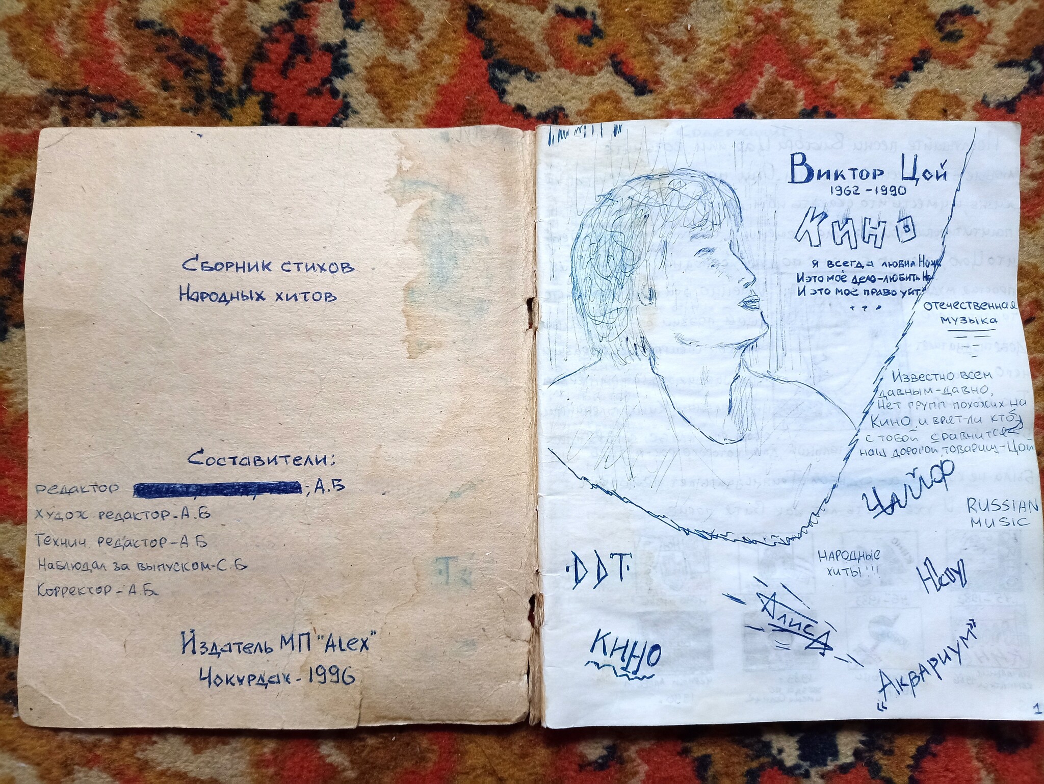 Этот песенник, отрисовали на коленке, в подъезде. Про принятое обозначения аккордов не имели понятия, и изображали струны и пальцы как есть. Это был 1996 год.