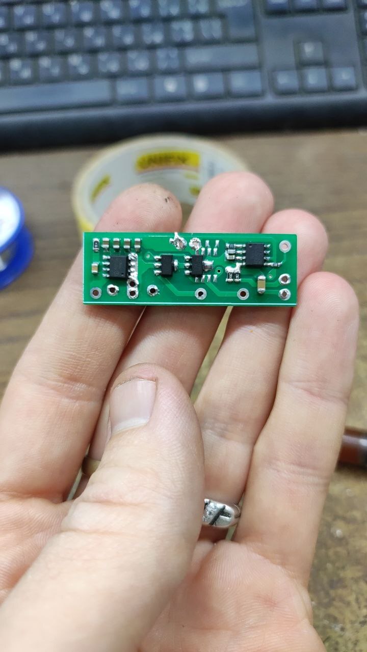 На плате контроллер защиты li-ion ip3005, ip5306 в качестве павербанка, 2 amc7135 на фонарики по одной на каждый (включает ip5306 долгим нажатием кнопки) и драйвер на mt3608 для заднего фонаря (стабилизация тока, ток 600 мА, напряжение около 9в) с регулировкой яркости шим с управлением от sgl2822w