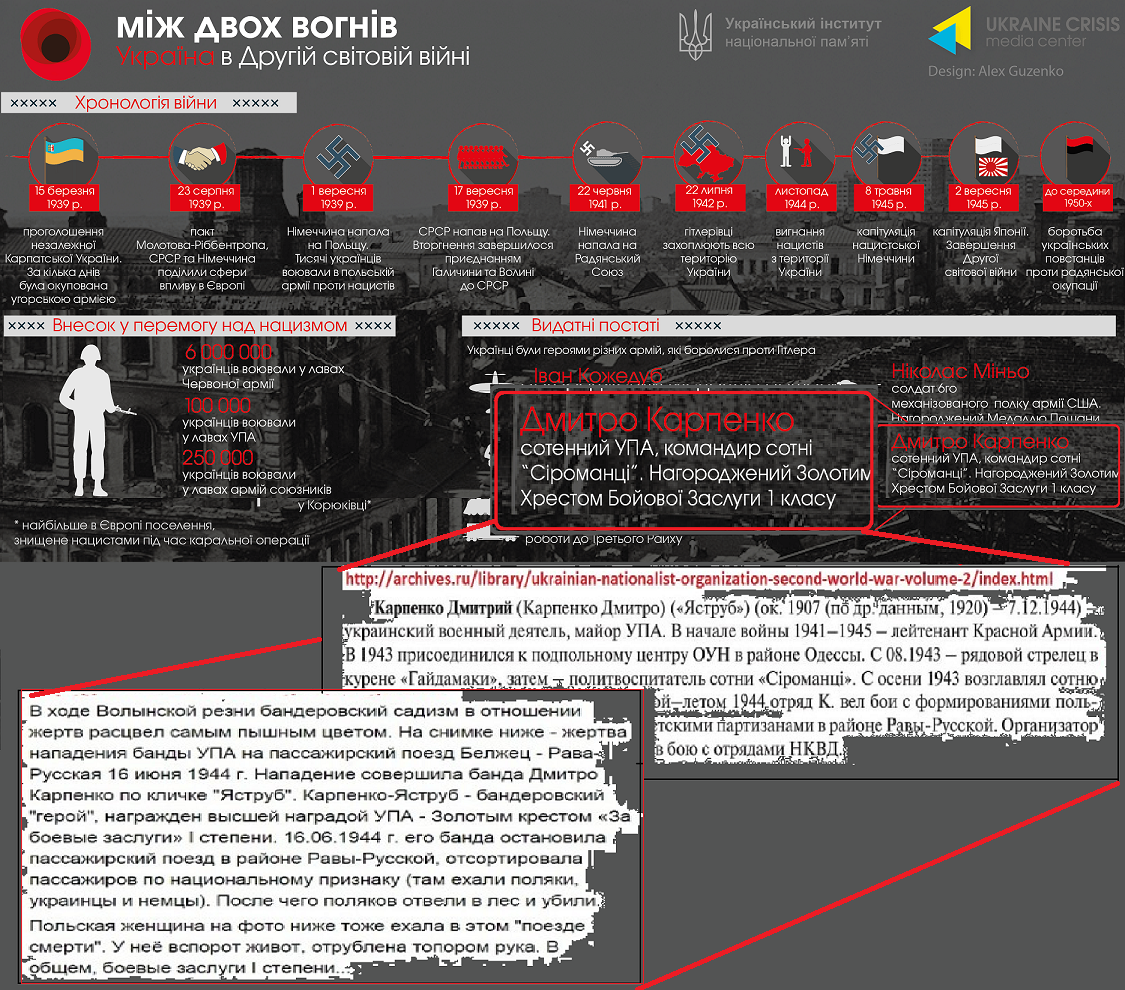 Пример того, как Институт национальной памяти переписывает историю. Рядом с украинцем Иваном Кожедубом, институт предлагает ставит нового "героя". Это - командир УПА Дмитро Карпенко. Имя Карпенко размещается на всех основных плакатах о Второй мировой войне. Погуглив по имени и фамилии этого героя, не сразу, но можно найти детали его повстанческой деятельности. Историки из Института национальной памяти, конечно же, об этих деталях знают, но так как других героев все равно нет, то выбирают Дмитро Карпенко. Просто потому, что следы его преступлений не лежат на поверхности, в отличие от других командиров УПА.