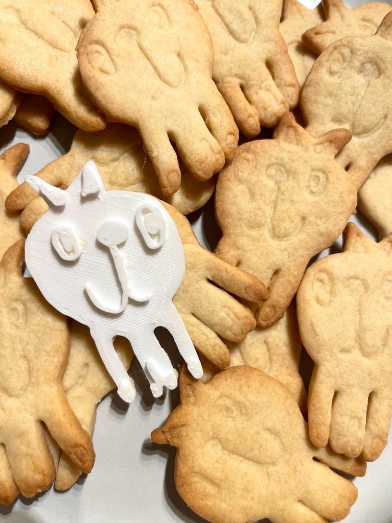 Вот и результат, вся семья хрустела и нахваливала. Тесто песочное. К сожалению первый вариант конструкции не пережил пытливые детские ручки, в месте крепления отломался слишком тонкий шток (так это называется?). Надо будет усилить, а пока вторую порцию делали двумя этапами - вырезка печенья и штамповка рисунка.