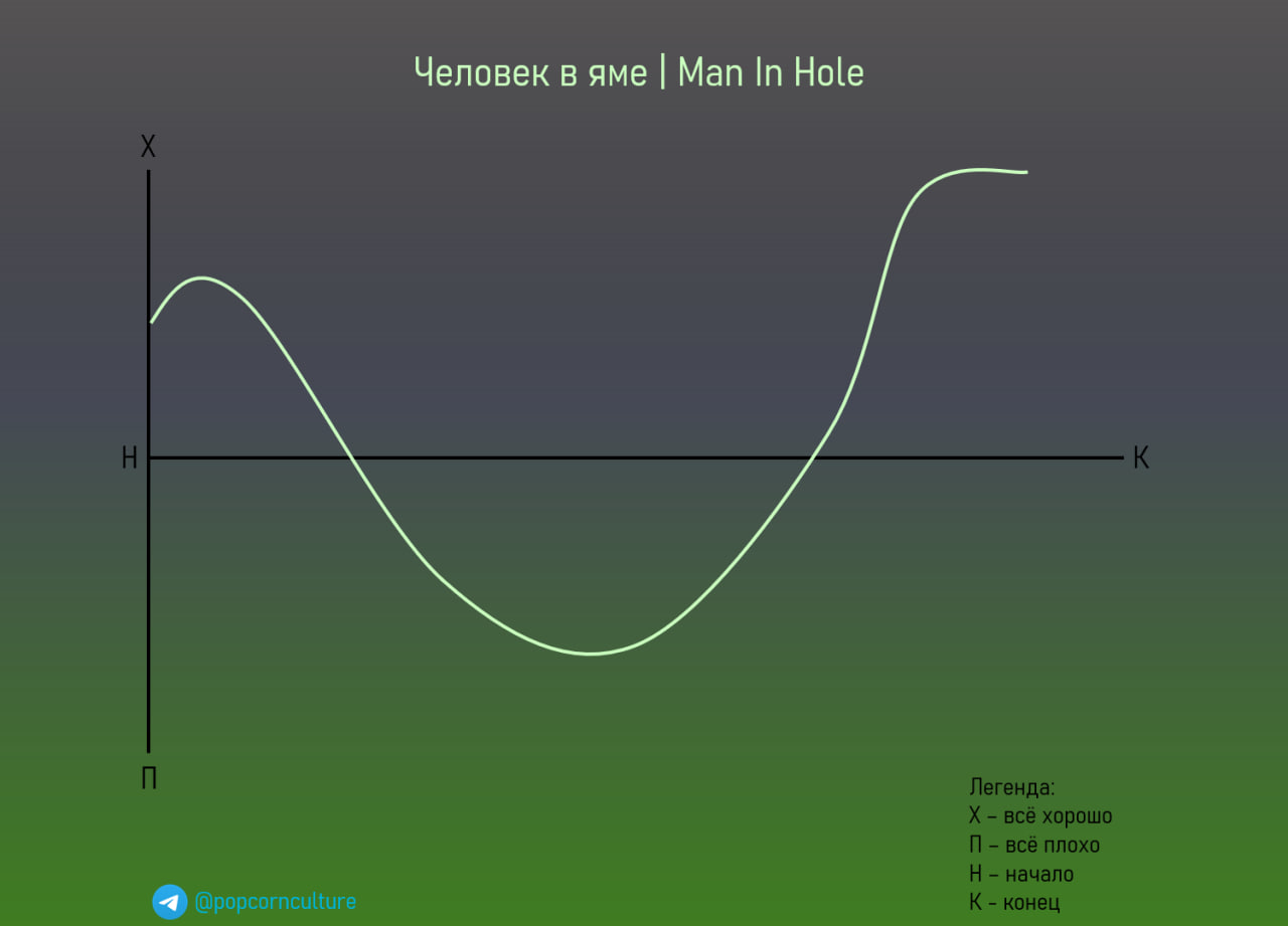 Воннегут говорил, что читателям (как и зрителям) нравится следить за героями, рассказ о которых начинается с чего-то хорошего, выше середины по оси ХП. Эта форма истории впервые нарушает устоявшуюся тенденцию.