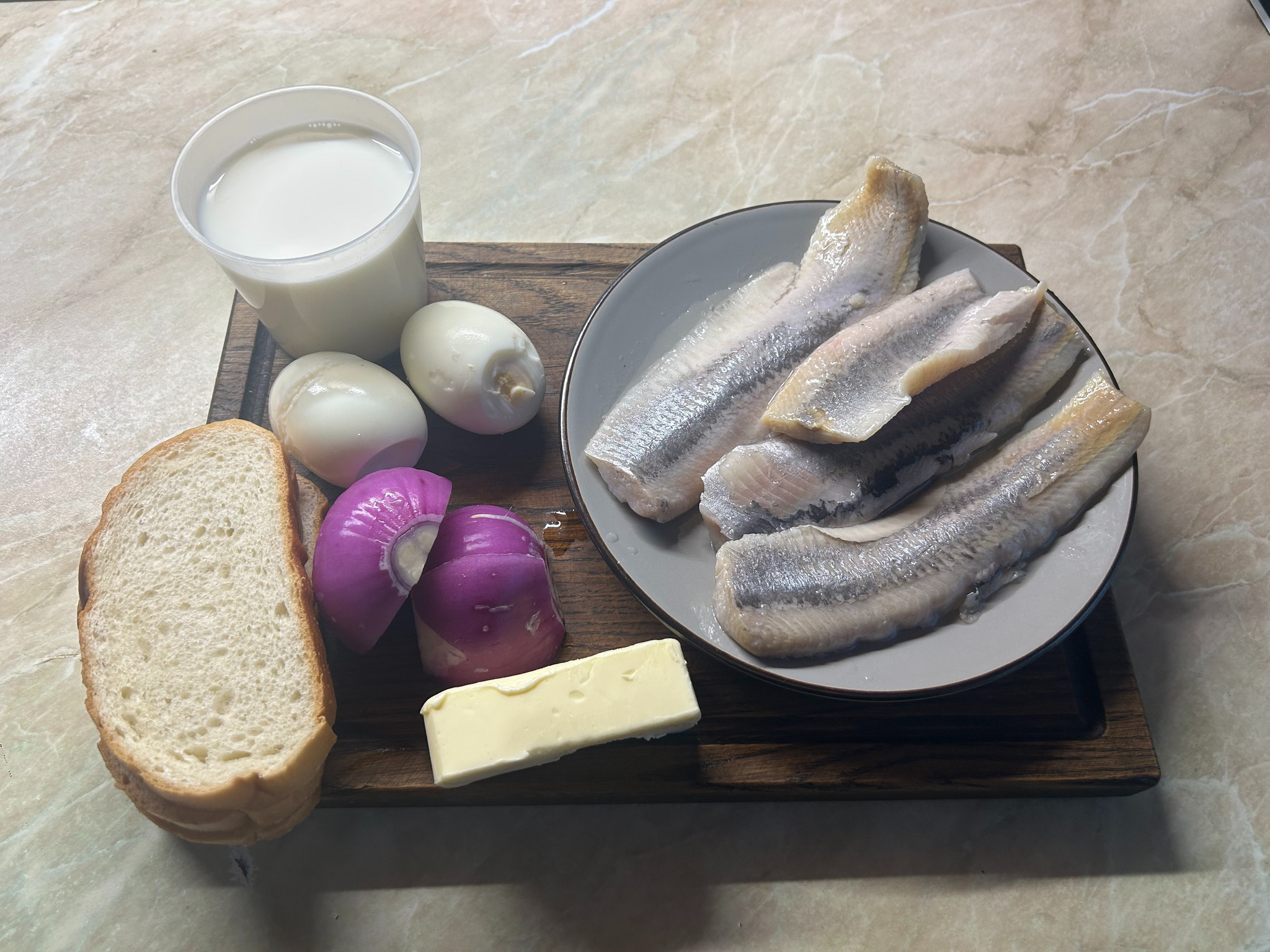 Для начала подготовьте вашу селедку, если берете уже готовое филе как у меня, все равно проверьте внимательно каждый кусок и в случае необходимости, извлеките кости.