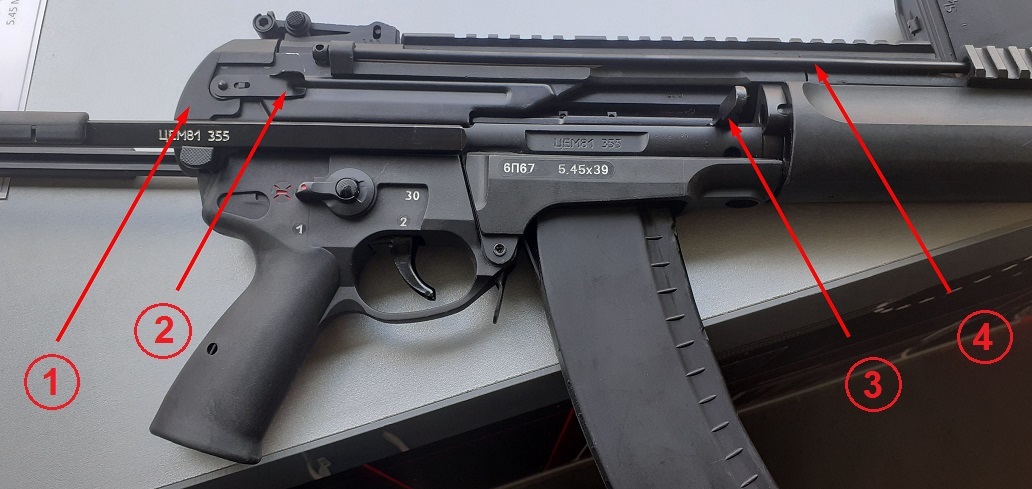 Во- первых, в конструкции оружия очень широко используется пластик- корпус УСМ целиком из пластика, как и крышка ствольной коробки, затыльник ствольной коробки, цевье и т.д.