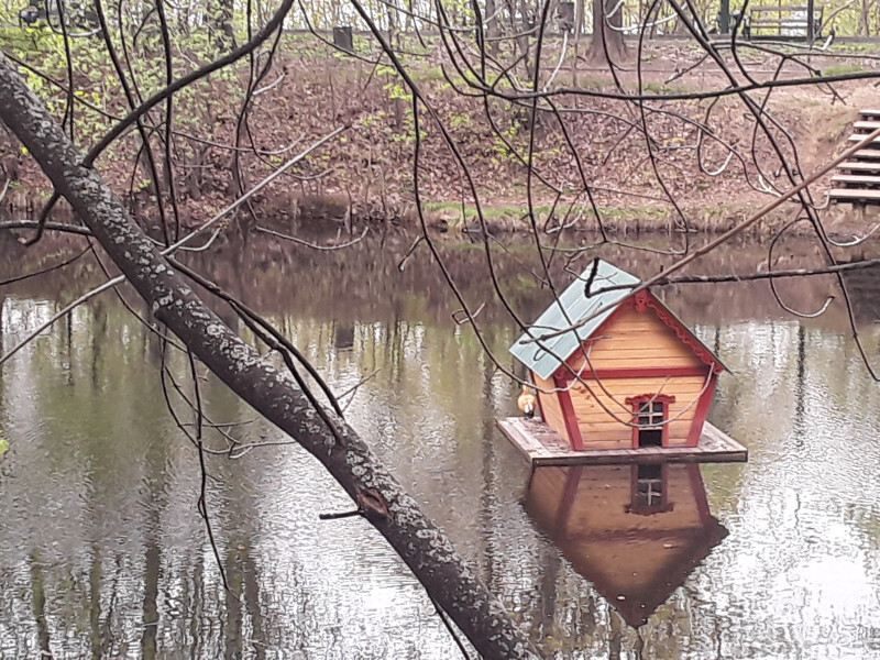 Есть у меня одна явно нездоровая страсть: ловить отражения в воде)) И особенно отражения домов ( и домиков) — даже если это домик для уточек. Мне всё время кажется, что отражённый дом — находится где-то в другом пространстве, и там кто-то живёт. Поэтому если домик на поверхности и домик отражённый создают единую картину, я сохраняю себе изображения.