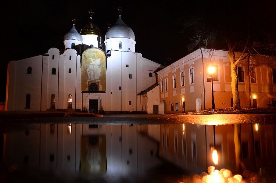 А знаете, как красиво в луже отражена Святая София в ночном кремле?