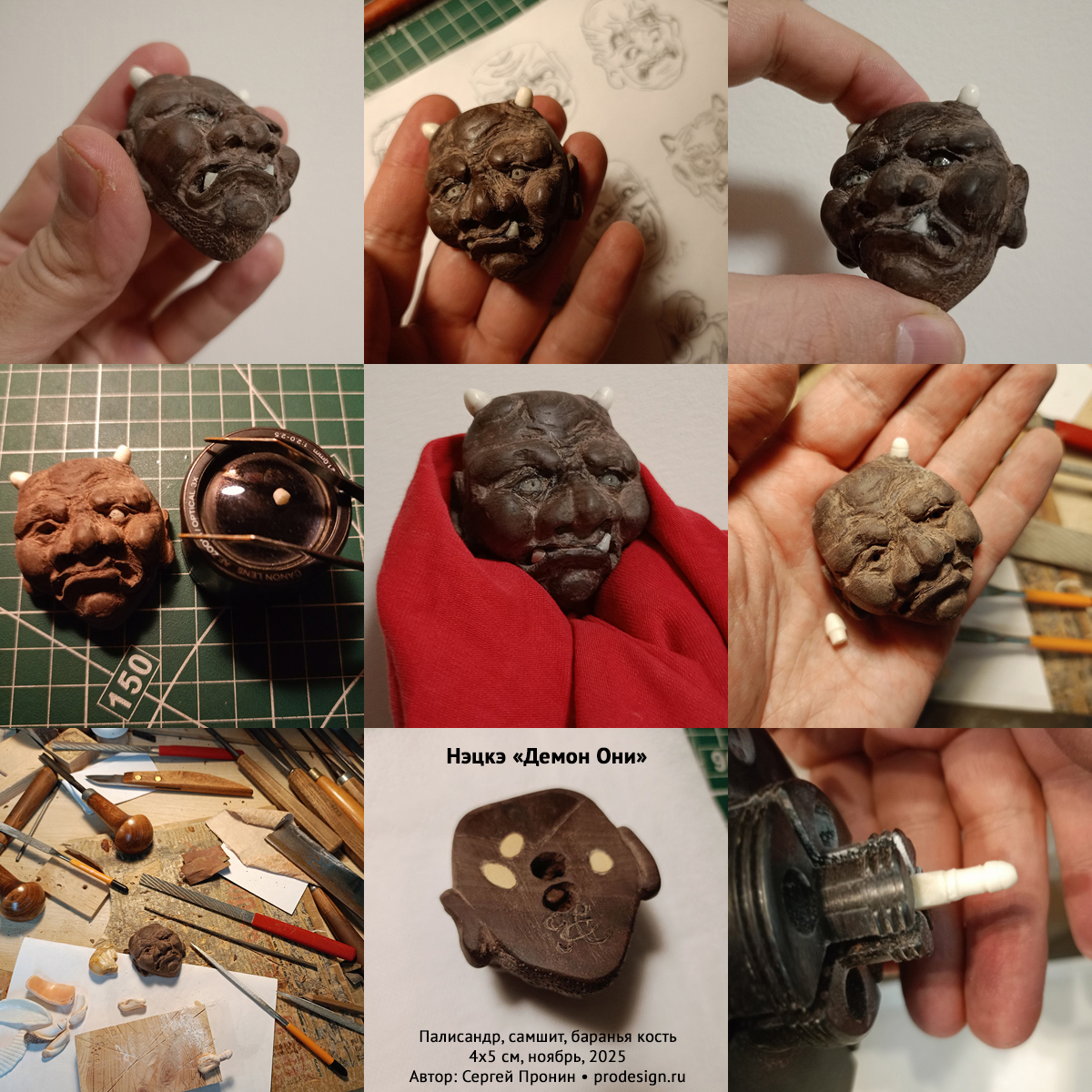 Маска демона Они — довольно распространенный сюжет в нэцкэ. Решил сделать свой вариант. Демон Они — один из самых главных плохишей в японской мифологии, восприятие образа которого в современное время несколько изменилось. Теперь маску Они можно увидеть и венчающей крышу здания, и в массовых шествиях, в качестве оберега от злых сил. Интересно — злодей, защищающий от злых сил! На обороте нэцкэ — соевые бобы, которых Они боится больше всего на свете. Существует даже японская традиция, посыпать пол в доме бобами, чтобы прогнать злого духа. «Бобы» выполнены из самшита.