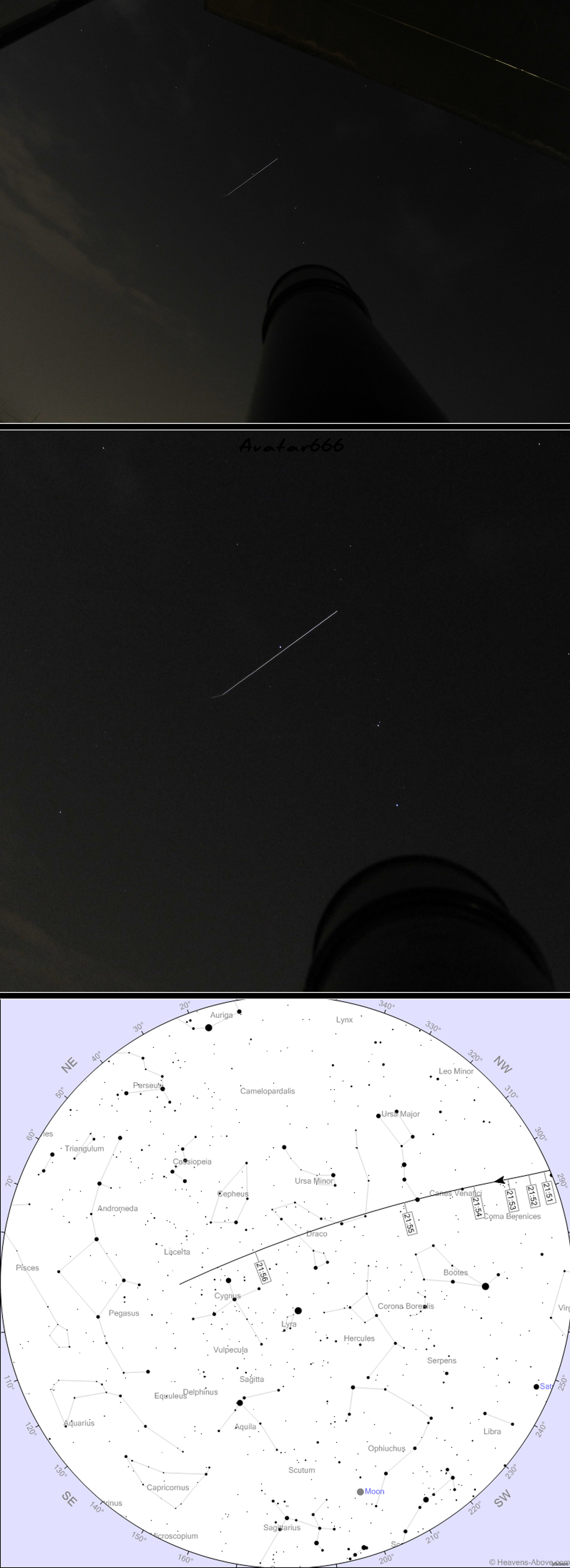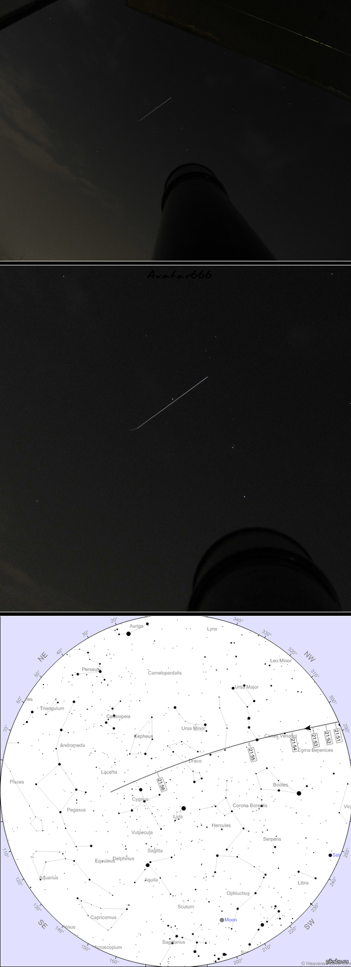 15 avatar666 Фото МКС с выдержкой 12 лет назад Фотографировал сегодня. Вместо штатива использовал телескоп. Выдержка 15 сек. Последняя картинка - траектория движения по небу из моего города. [моё] МКС Фотография