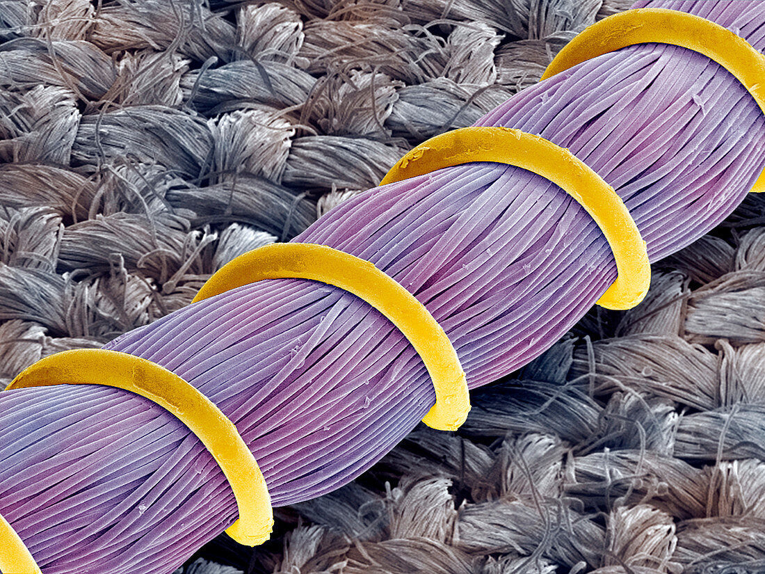 9. Микрофотография части нагревательного элемента электрического одеяла. Проволока (золотая) намотана на пучок изолированных проводов, образующих нагревательный элемент. Увеличение: х50 при печати шириной 10 сантиметров.