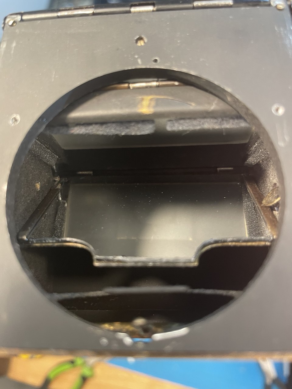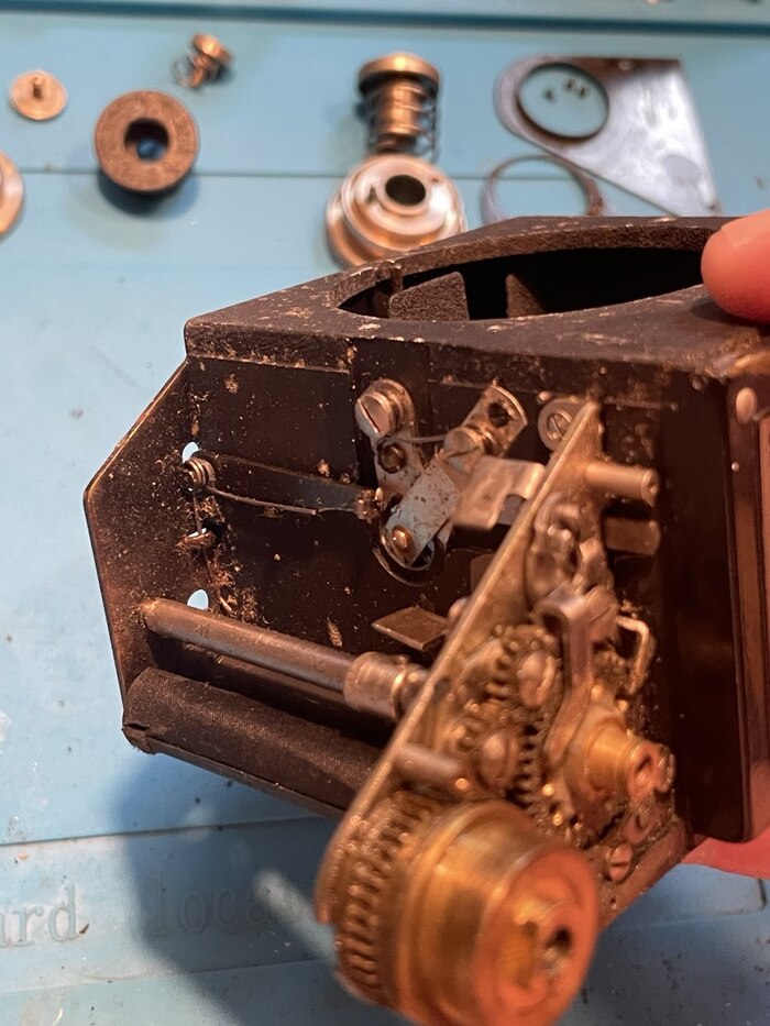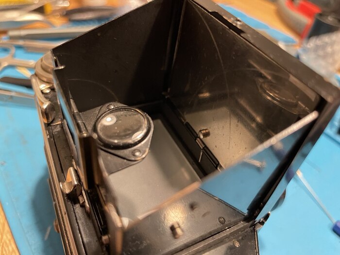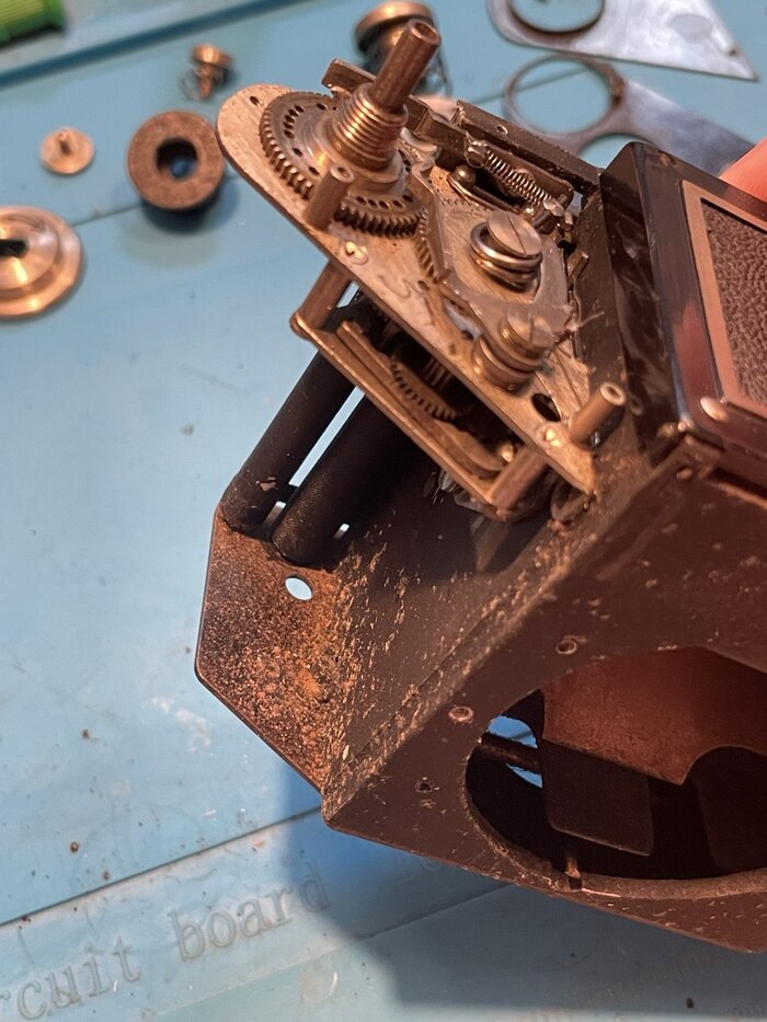 Полностью перебрана шахта видоискателя - теперь не заедает, открывается сама, и лупа встает в правильное положение.