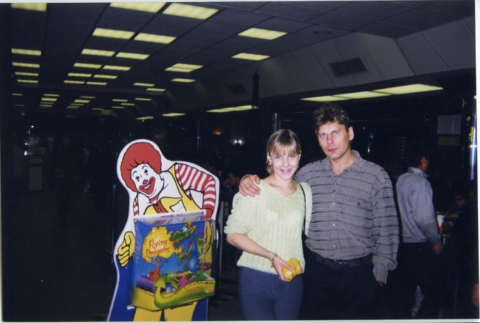 Лидер группы «Сектор Газа» Юра Хой со своей поклонницей, которую встретил в макдональдсе. Россия, 1998 год.