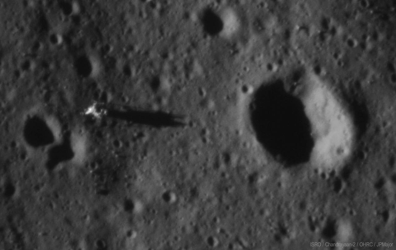 Самое важное тут то, что этот снимок лунной поверхности сделан индийским орбитальным окололунным аппаратом "Чандраян-2" в апреле 2021 года. Кстати, этот аппарат сделал фотографии мест посадок других миссий "Аполлонов". На них, как вы поняли, тоже можно увидеть те же самые лунные посадочные модули и другую аппаратуру, оставленные на Луне американцами.