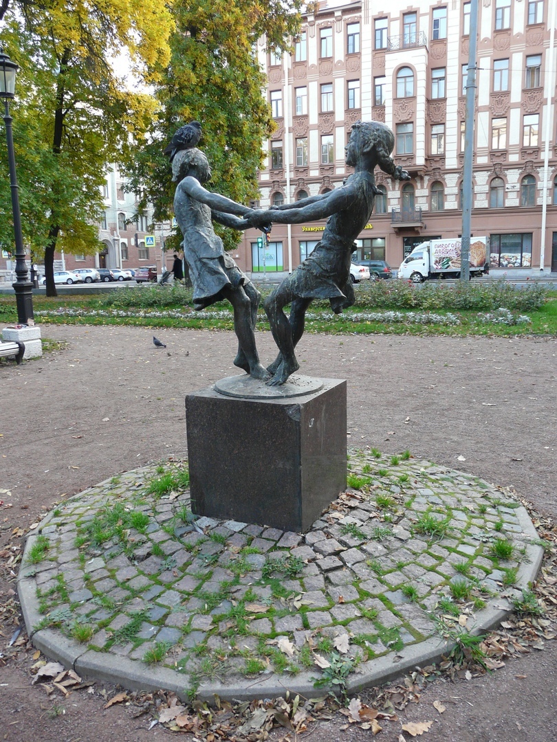 Пионерки с Каменноостровского. (хотя по гуглу это "Дружба" в сквере Аникушкина) Для начала пришлось выгнать голубей. Это засранцы явно патрулировали это место, так что после изгнания с головы одной особи — прилетело этих «дайпожрать» десятка два. Будучи посланными — обиженно улетели, но оставили одного «курлыка». Который взгромоздился опять же на голову.
