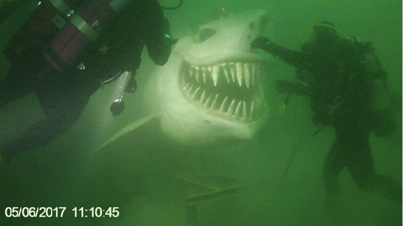 Подводная статуя в виде акулы в Невшательском озере, Швейцария