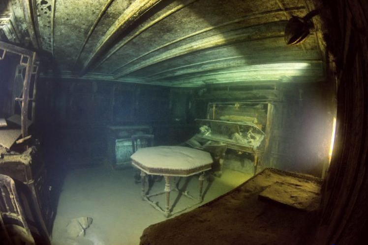 Яхта "Гунильда" длиной 60 метров, построенная в Лейте, Шотландия, в 1897 году, затонула в 1911 после того, как ударилась о камни, и ее не удалось спасти. Вид внутри.