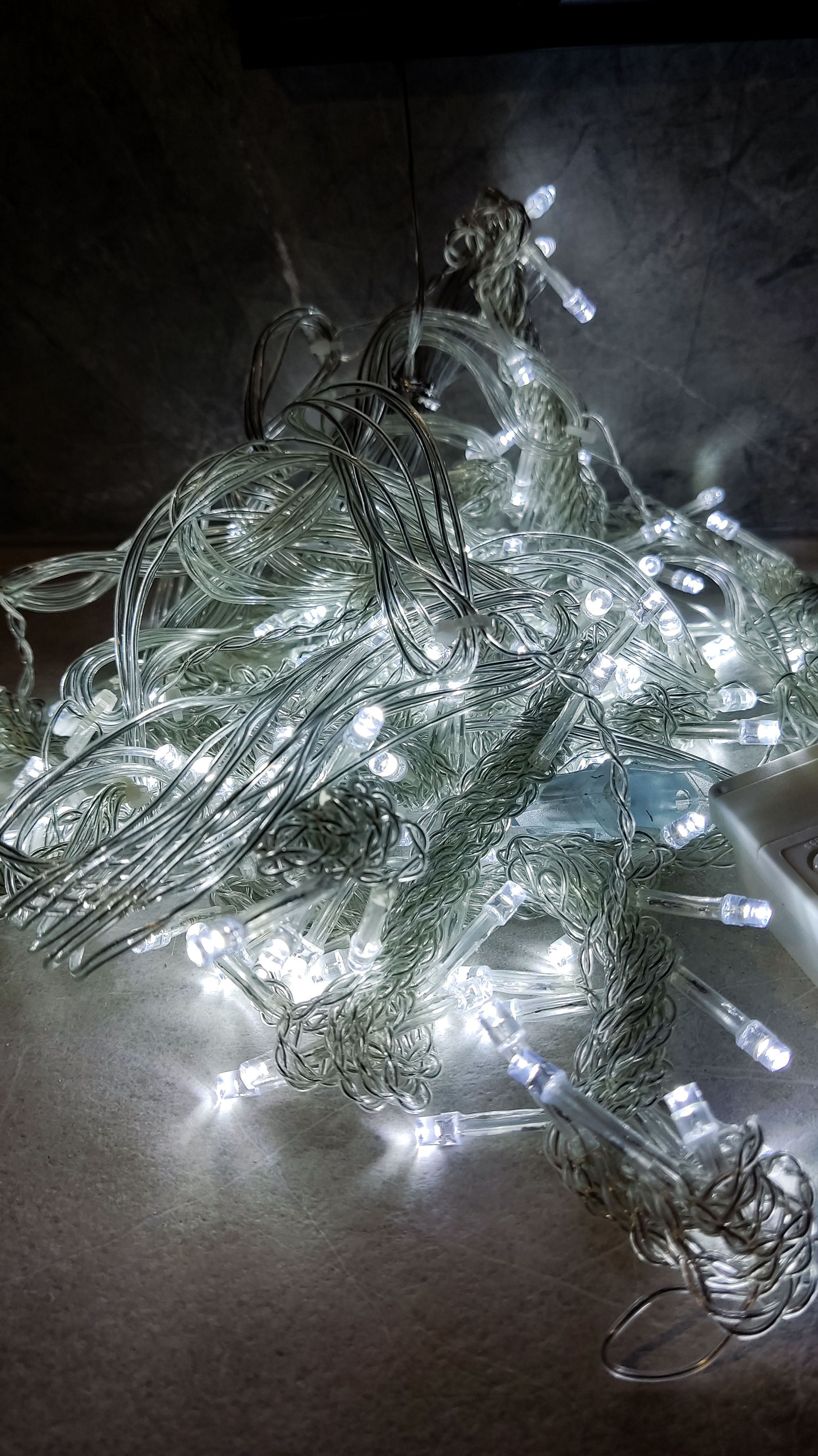 На фото одна из тех гирлянд, которые будут висеть на этот праздник у меня. Это так называемый дождик, метры медных проводков в прозрачной оплетке заканчиваются аккуратными лампами, в которые впаян диод. Вблизи смотрится очень интересно.
