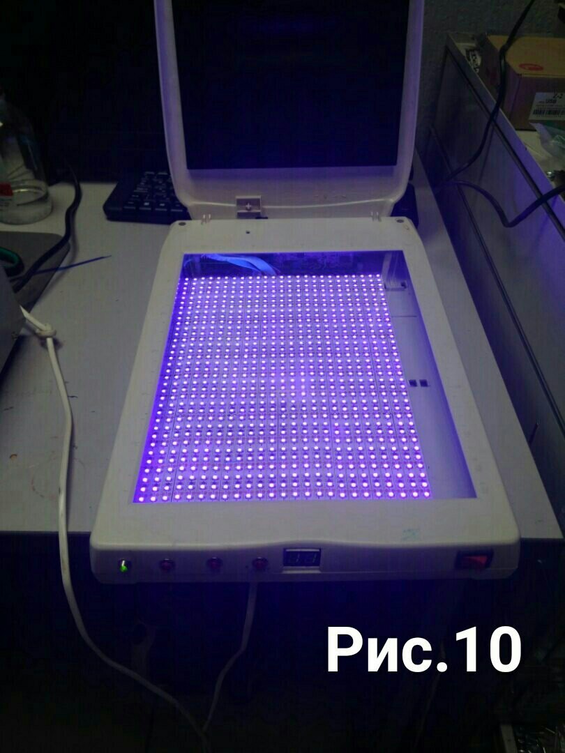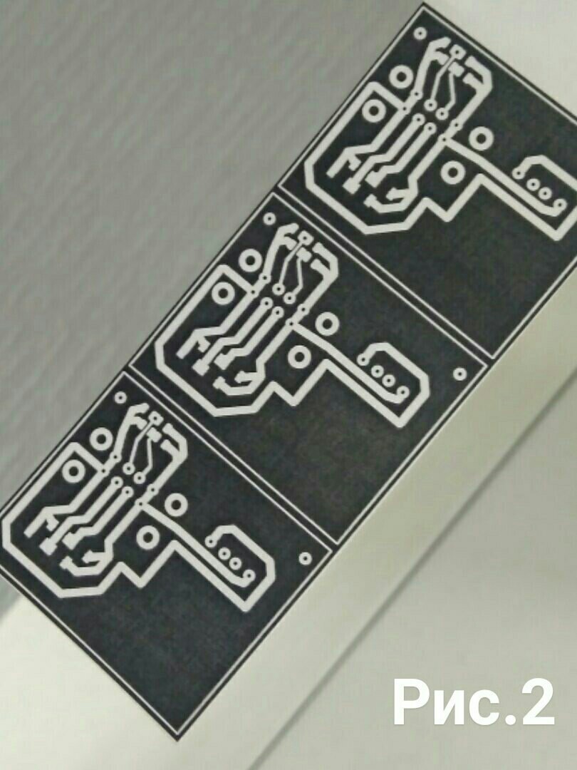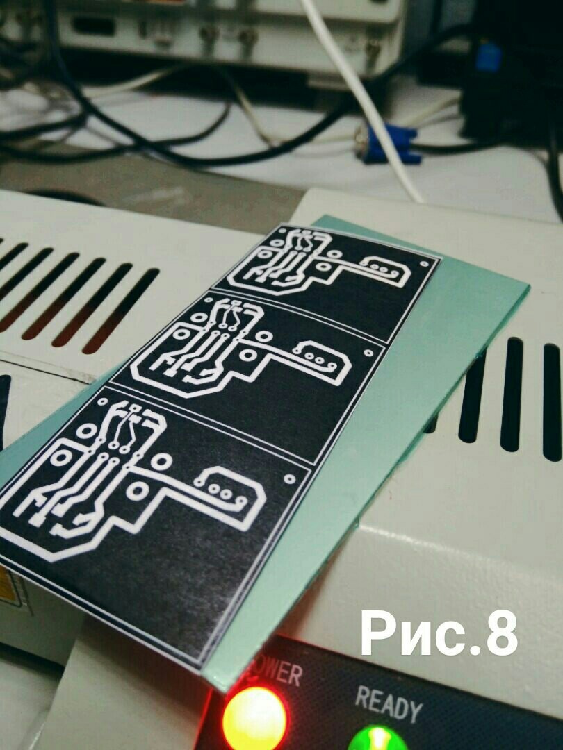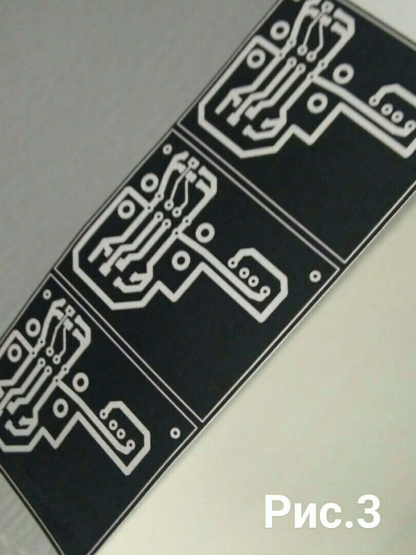Нам осталось произвести экспонирование и непосредственно травку платы, для этого наш шаблон он "негативный" то есть где белые части шаблона (рис.8) они подвергаются засвету ультрафиолетовой лампой, этим самым эмульсия твердеет, под чёрными частями она остаётся прежней, далее она будет очищена с платы .