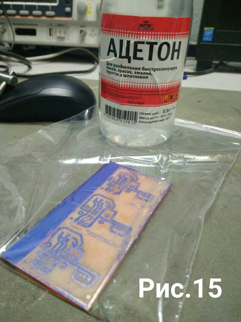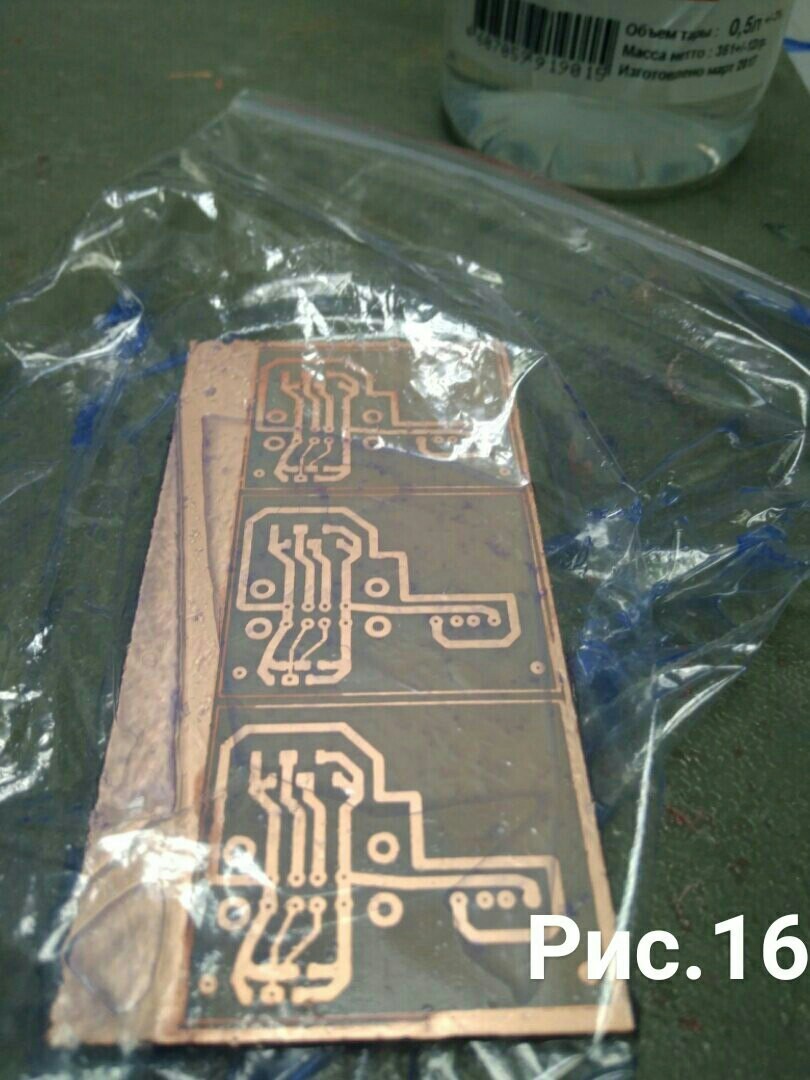 Процесс завершён , но есть ещё одна малость остатки фоторезиста на плате , его мы уберем с помощью ацетона , в пакетик достаточно пару капель , т.к ацетон хороший растворитель его пары справятся с этой задачей за 10 секунд (рис;15-16) , так же можно все это сделать раствором щёлочи, после этого ещё раз промыть и плата готова (рис.17) , весь процесс у меня занимает 25-30 минут, когда делал первый раз провозился 1.5-2часа.