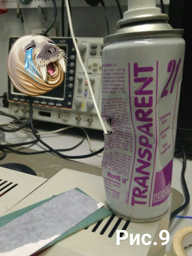 Для того что бы перевести шаблон на фоторезист на понадобится аэрозоль "TRANSPARENT" (рис.9) эта штука сделает бумагу полупрозрачной , кладём напечатанной стороной на плату для большей фокусировки , выводим излишки жидкости и воздуха (они нам не нужны), и кладём под лампу (рис.10) ( с выдержкой нужно определится заранее на кусочке фоторезист а) и начать наконец-то ее экспонировать ......