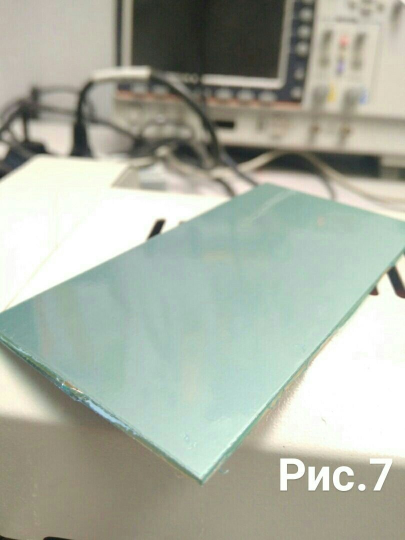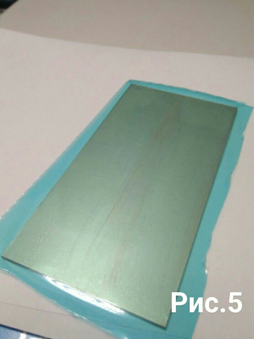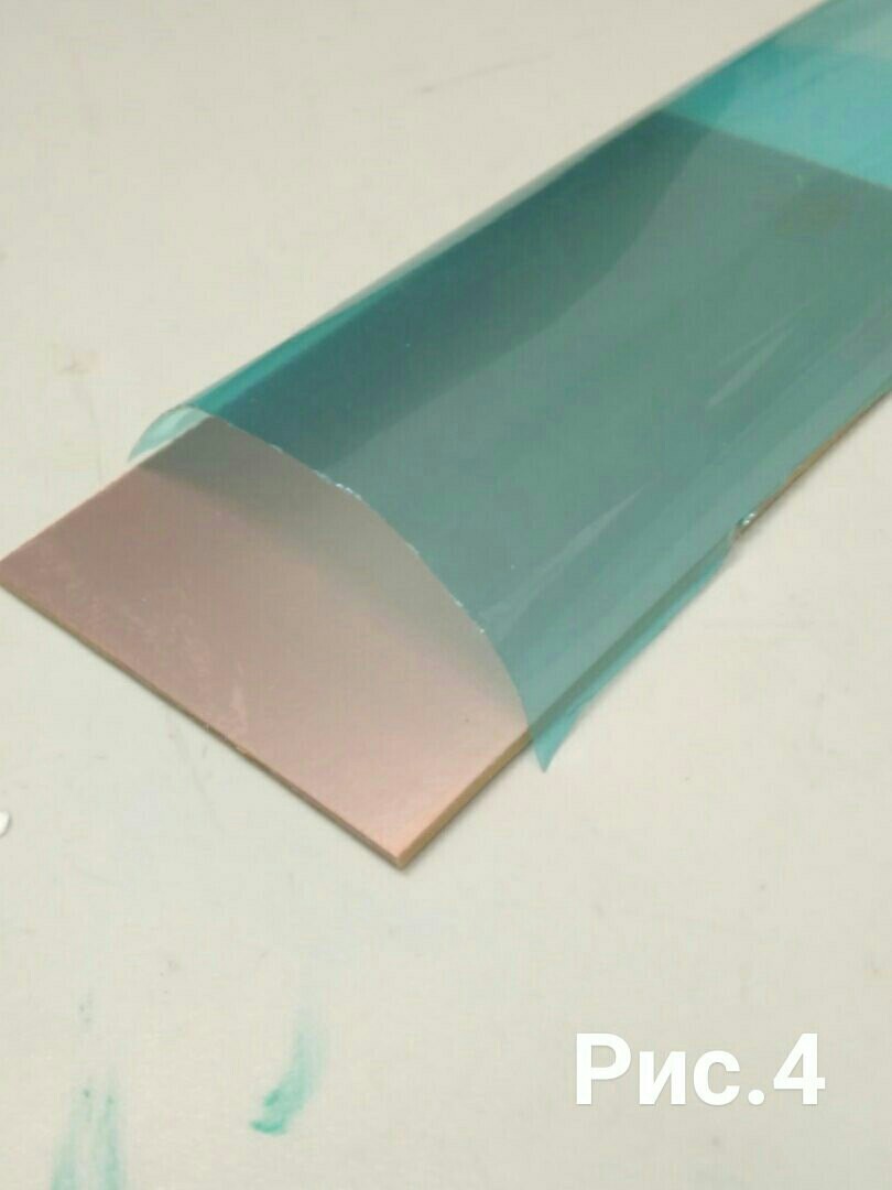 На этом пока все , далее вырезаем фоторезист по размеру платы , оставляем отступ с каждой стороны по 1-1.5 см , кусочком скотча или другим методом снимаем с нашей заготовки(рис.4) фоторезиста пленку (мягкая пленка) , и прикладываем липкой стороной к самой плате , не допуская пузырьков расскатываем пленку по всей поверхности получаем почти готовую заготовку (рис.5) для того что бы фоторезист хорошенько прилип можно прогреть его утюгом , я делаю это при помощи ламинатора (рис.6), только после этого можно сказать что заготовка готова (рис.7)